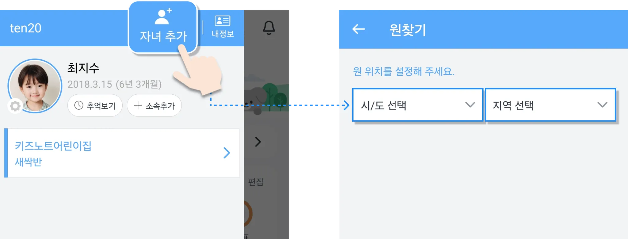 자녀 추가 버튼을 누르고, 원 위치를 설정해 주세요.