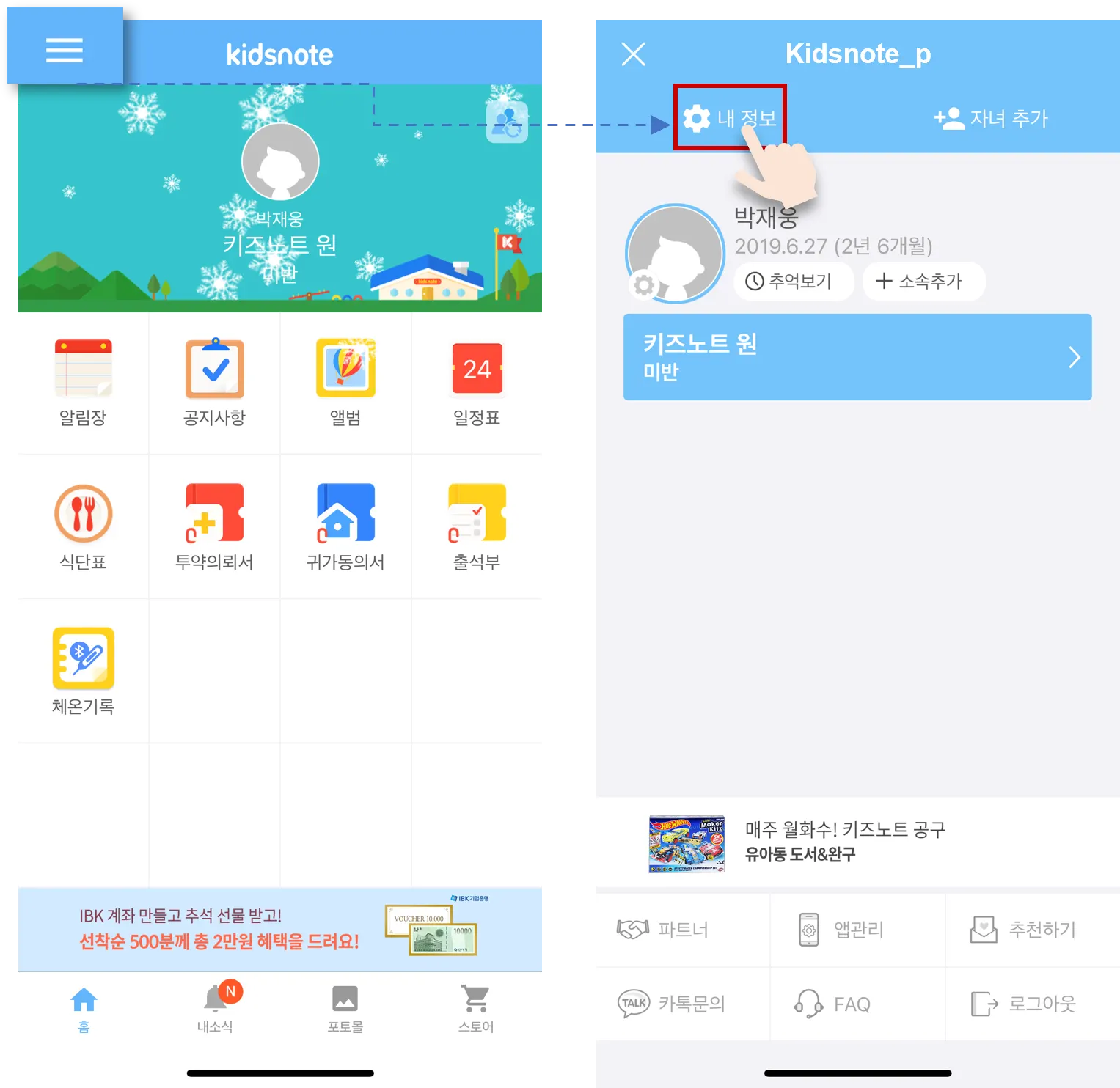 키즈노트 App에서 좌측 상단의 를 선택합니다.