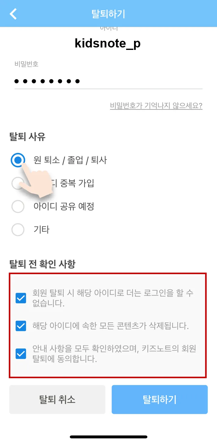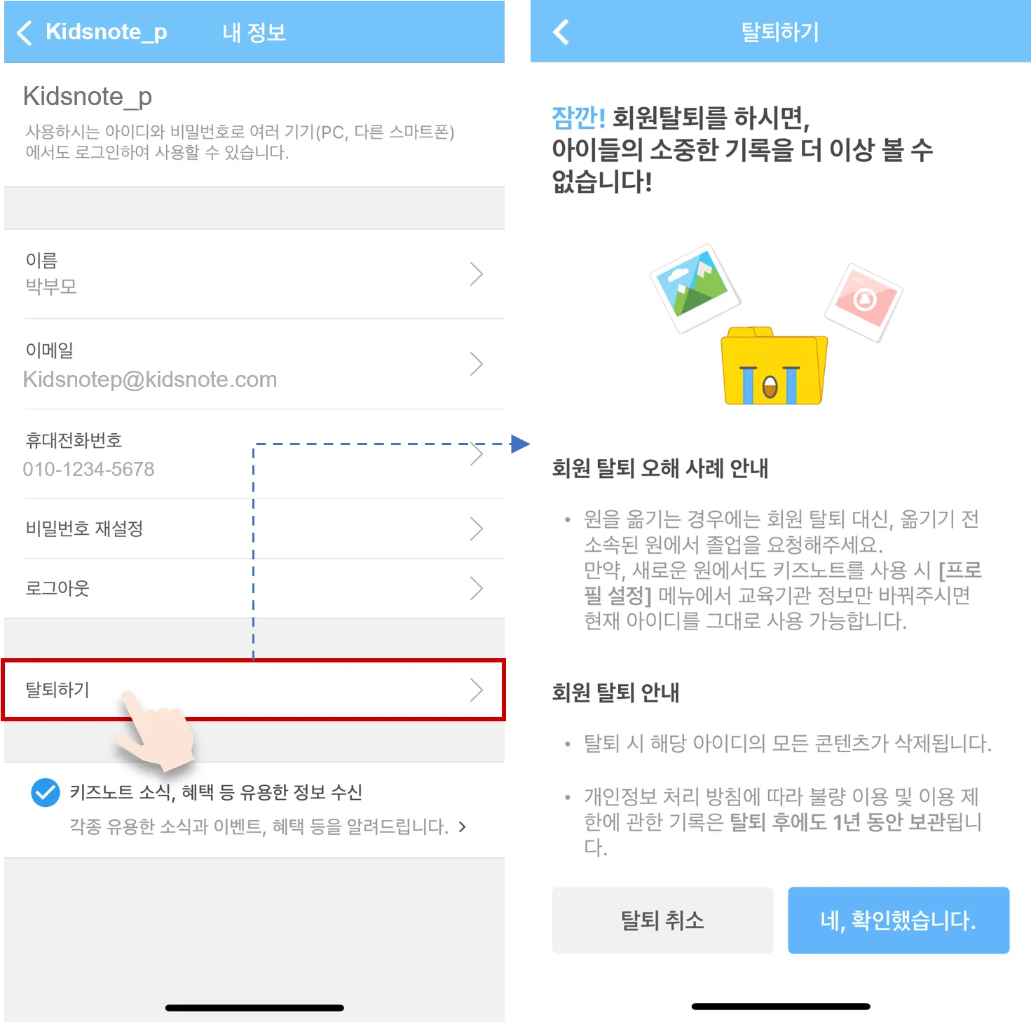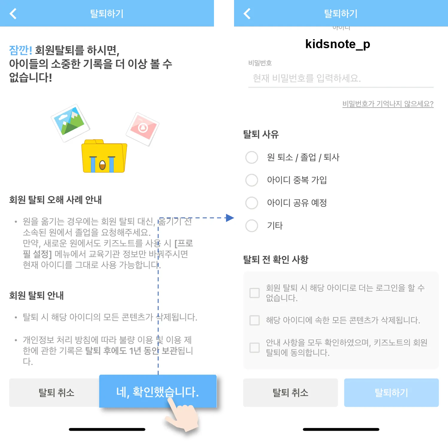 키즈노트 회원 탈퇴를 하는 경우, 아이디의 모든 콘텐츠가 삭제됩니다.
