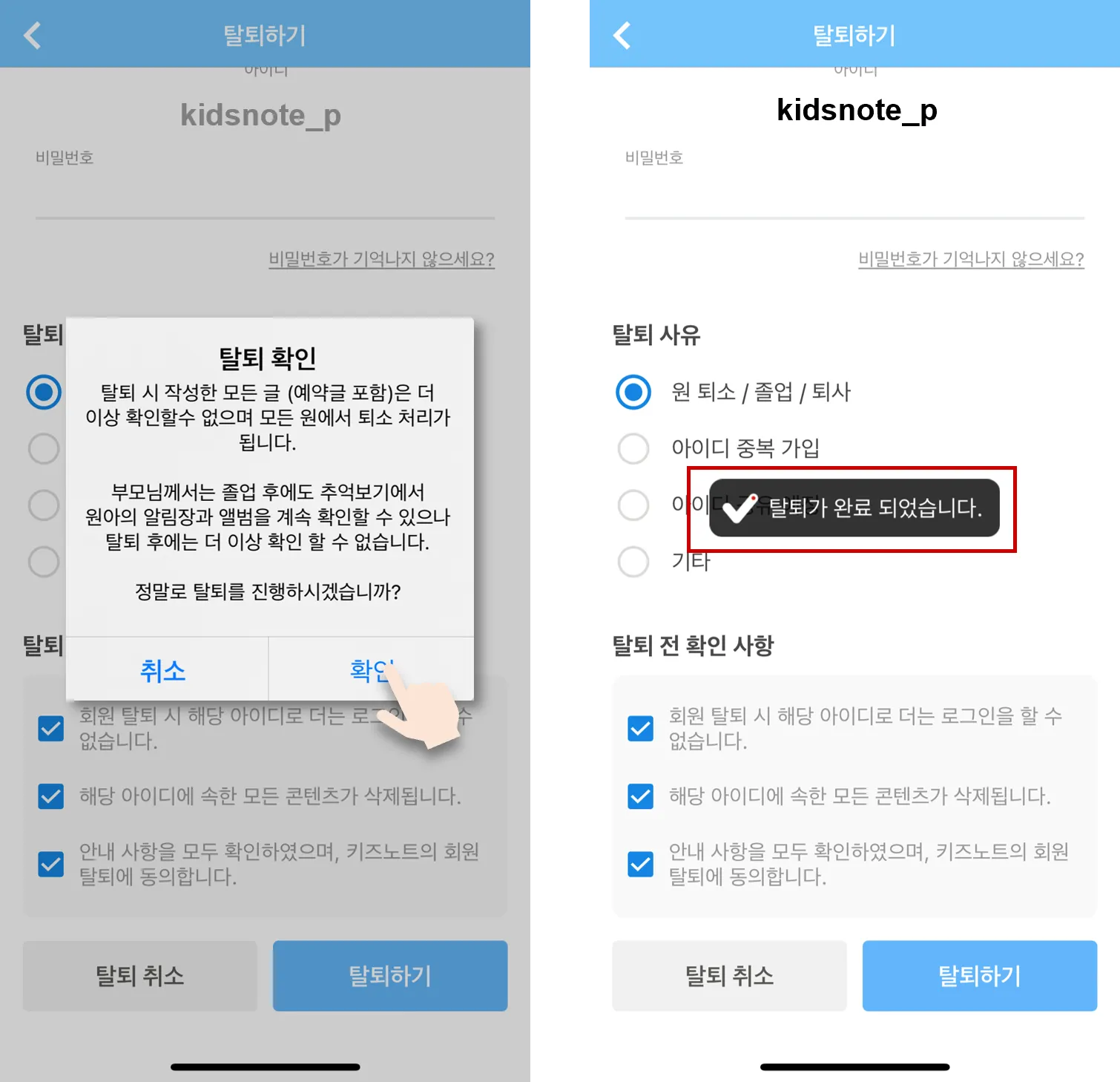 탈퇴 확인을 선택하면, 탈퇴가 완료됩니다. - 탈퇴 시 작성한 모든 글(예약글 포함)은 더 이상 확인할 수 없으며, 모든 원에서 퇴소 처리가 됩니다. 부모님께서는 졸업 후에도 추억보기에서 원아의 알림장과 앨범을 계속 확인할 수 있으나 탈퇴 후에는 더 이상 확인 할 수 없습니다. - 탈퇴 시 내가 작성했던 예약 글은 사라지며, 전송되지 않습니다.