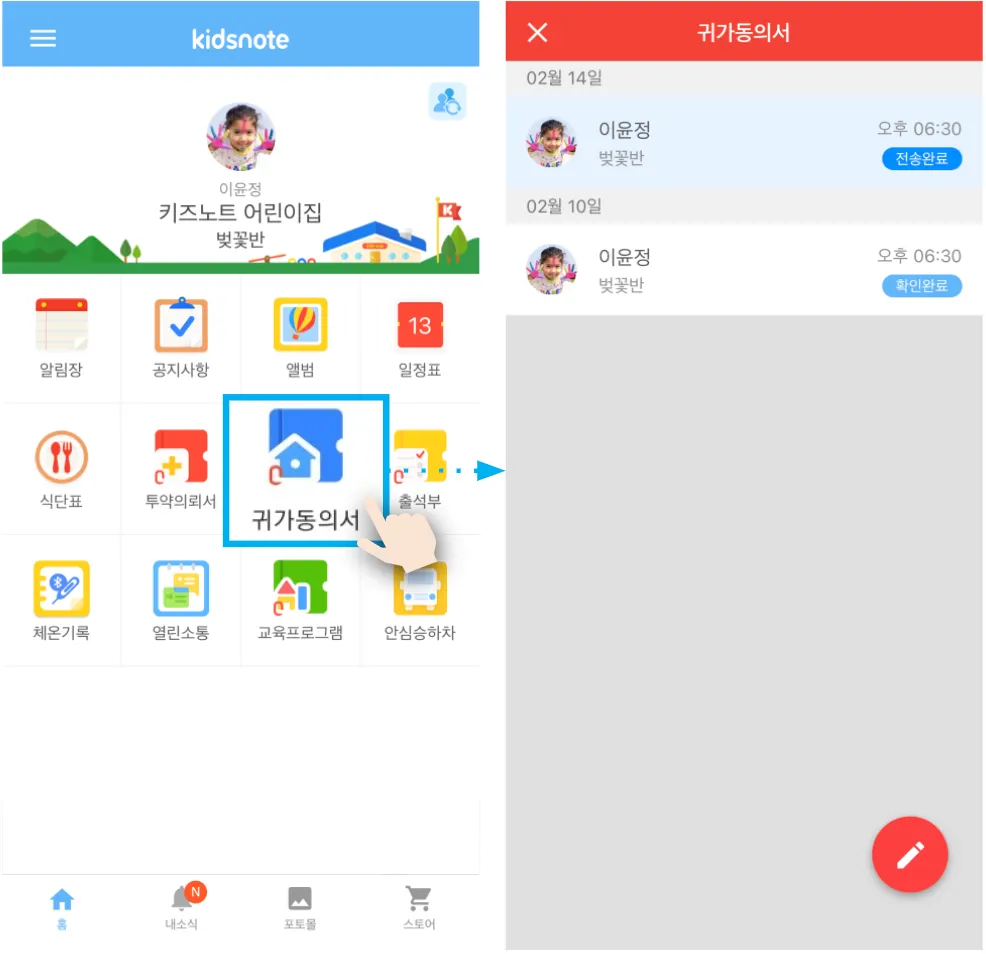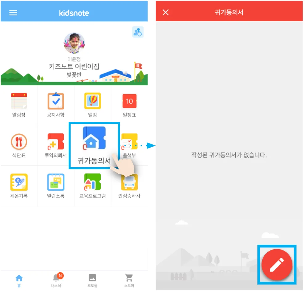 키즈노트 App에서 귀가동의서를 선택합니다.