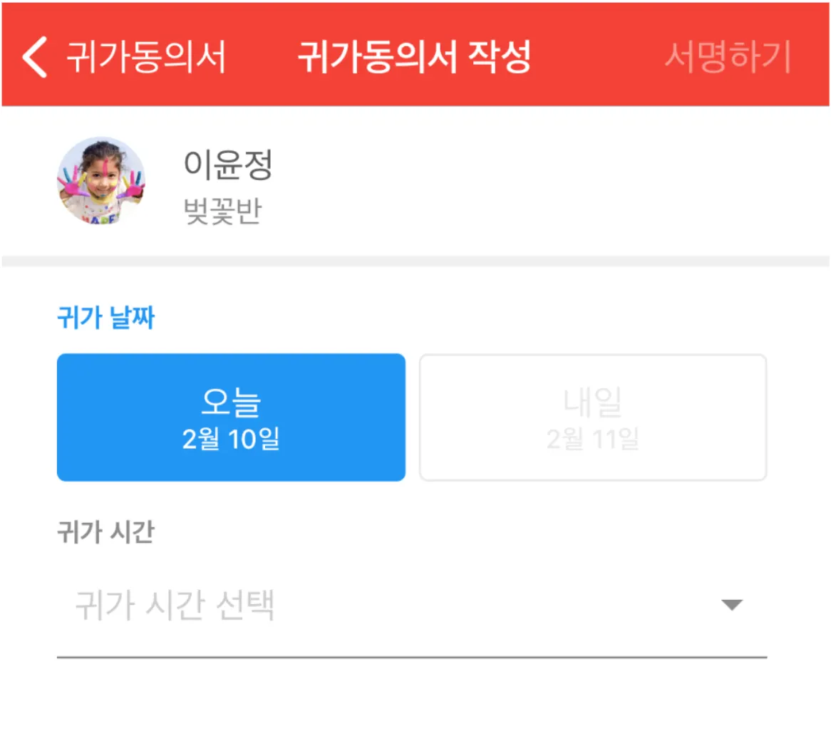 평소와 하원 방식이 다른 날의 경우 안전한 귀가를 위해 귀가동의서를 작성할 수 있습니다.