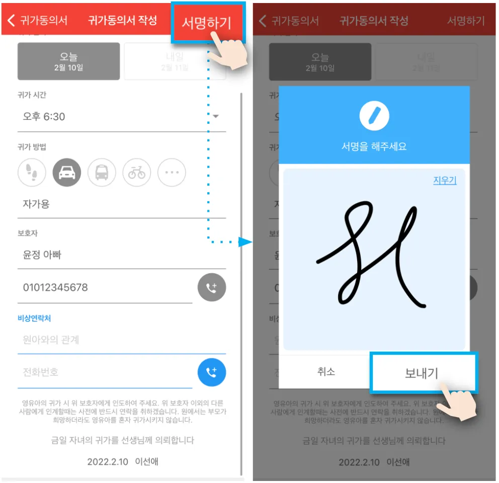 귀가동의서 작성이 완료되었으면 서명하기를 눌러 주세요.