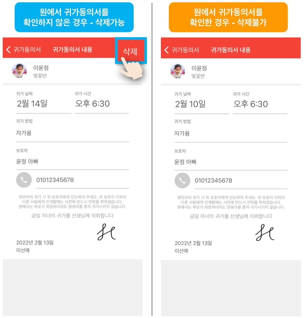 - 원에서 귀가동의서 수신 확인을 완료했을 경우 삭제가 불가합니다.