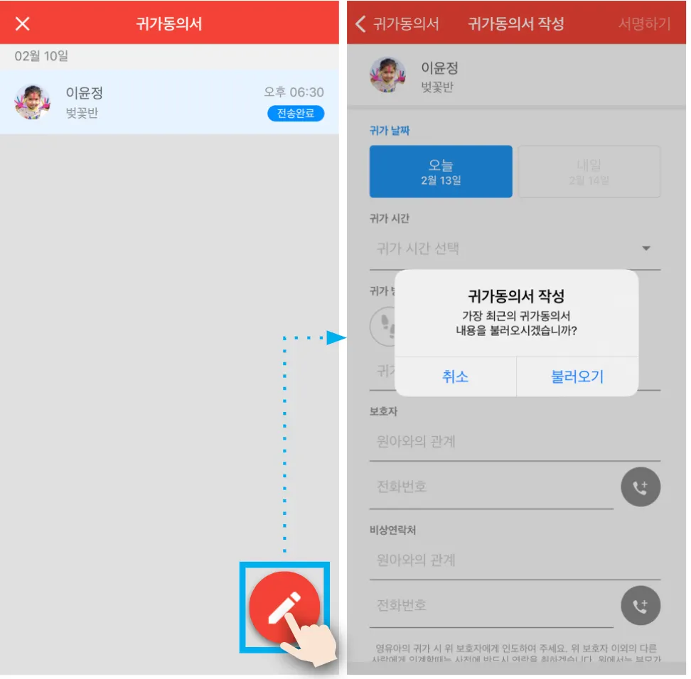 불러오기 기능을 통해 가장 최근의 귀가동의서 내용을 손쉽게 불러와 작성할 수 있습니다. 또한, 원에서 확인하기 전 귀가동의서는 삭제할 수 있습니다.