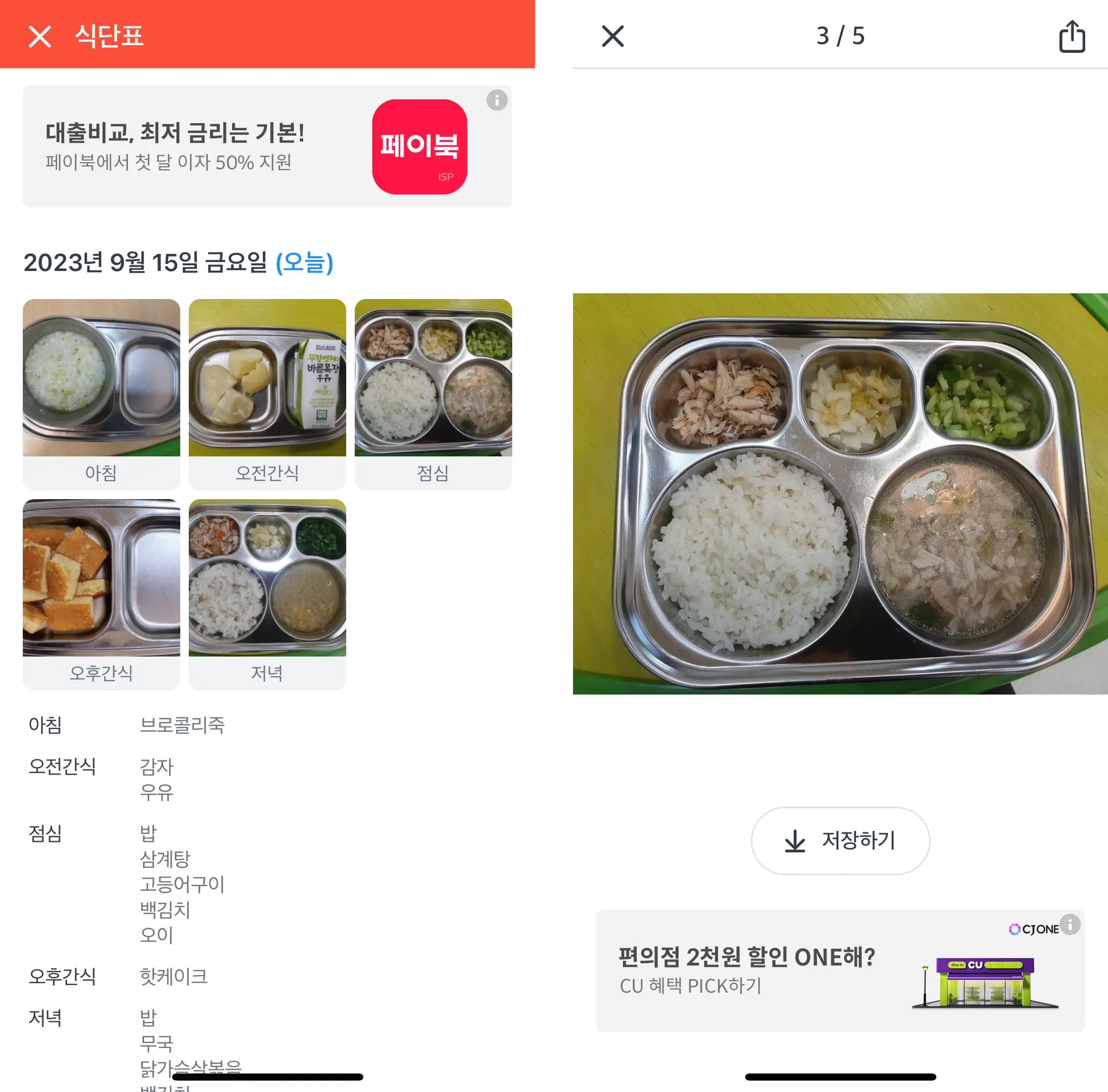 - 확대한 그림을 끄지않고 화면을 넘기면 식단 사진을 바로 볼 수 있습니다.