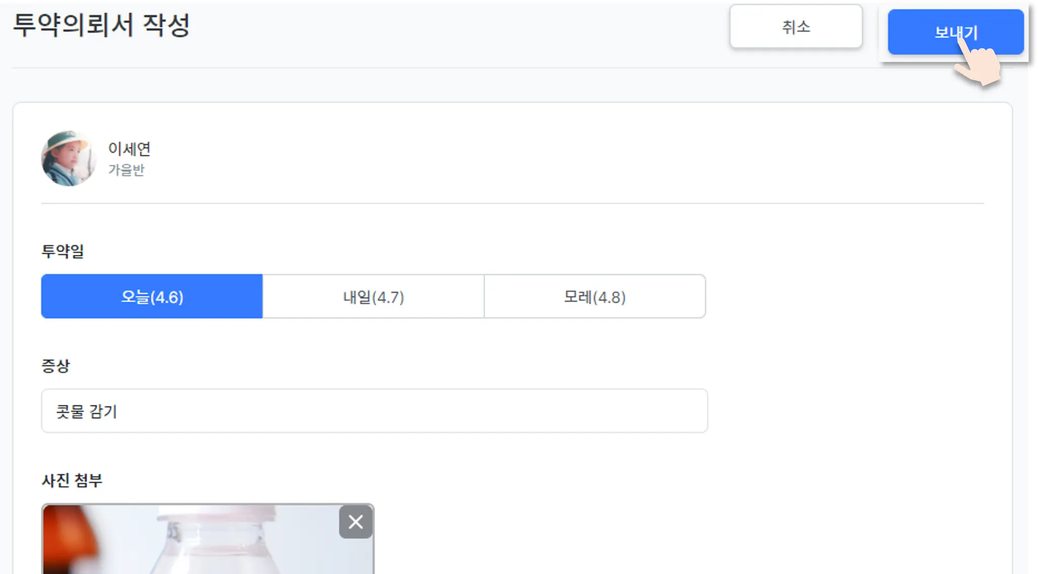 투약의뢰서 내용을 모두 작성했으면 보내기를 클릭하여 원에 투약의뢰서를 전송합니다.
