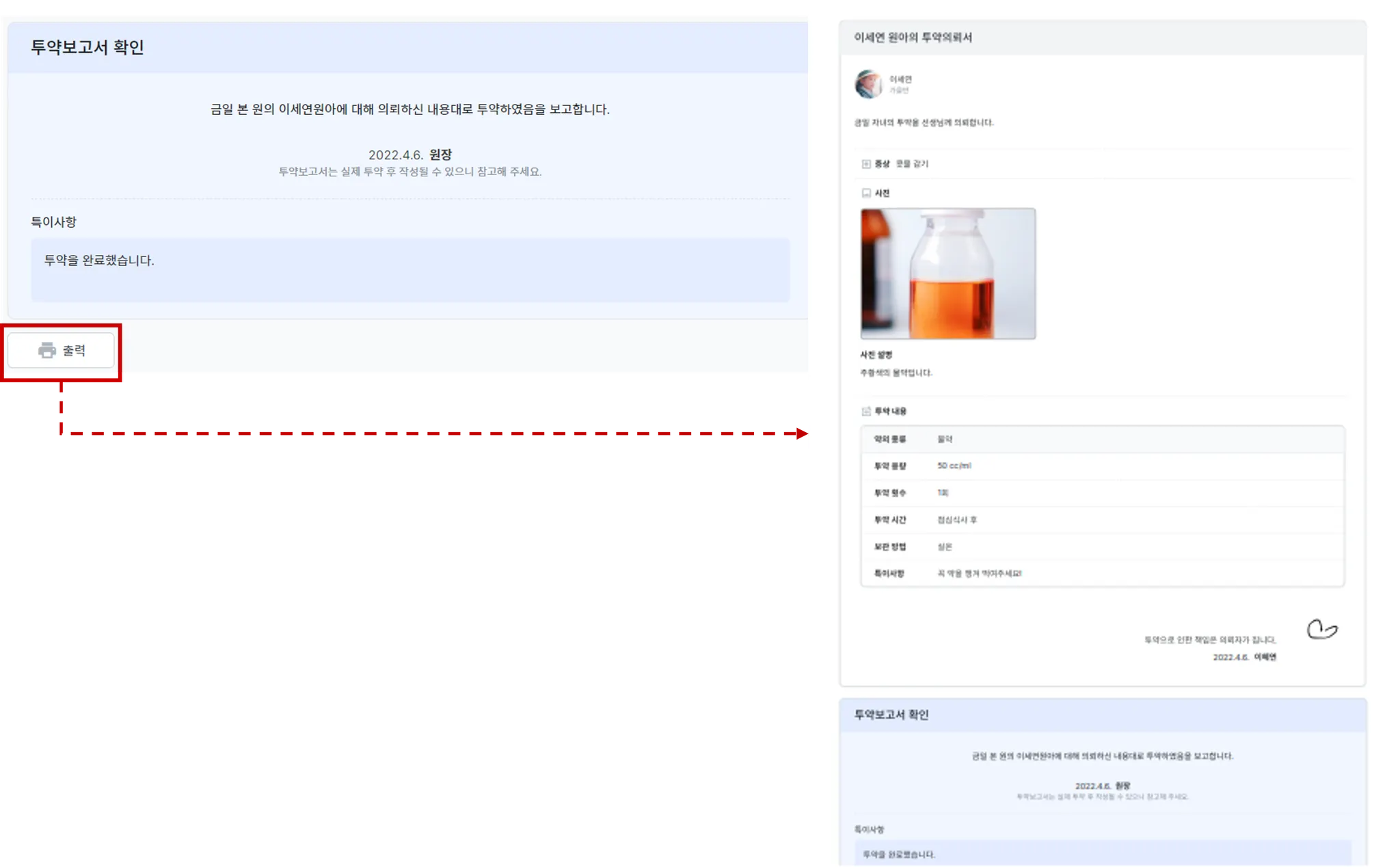출력 기능을 통해서는 해당 투약의뢰서&투약보고서를 바로 출력할 수 있습니다.