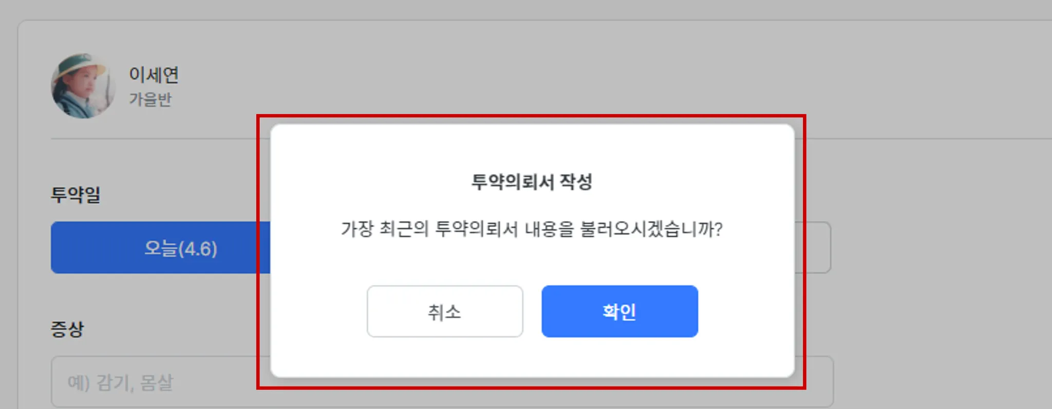 - 투약의뢰서 작성 화면에 들어가면 자동으로 뜨는 불러오기 팝업창 내용을 보고, 확인를 클릭해주세요.