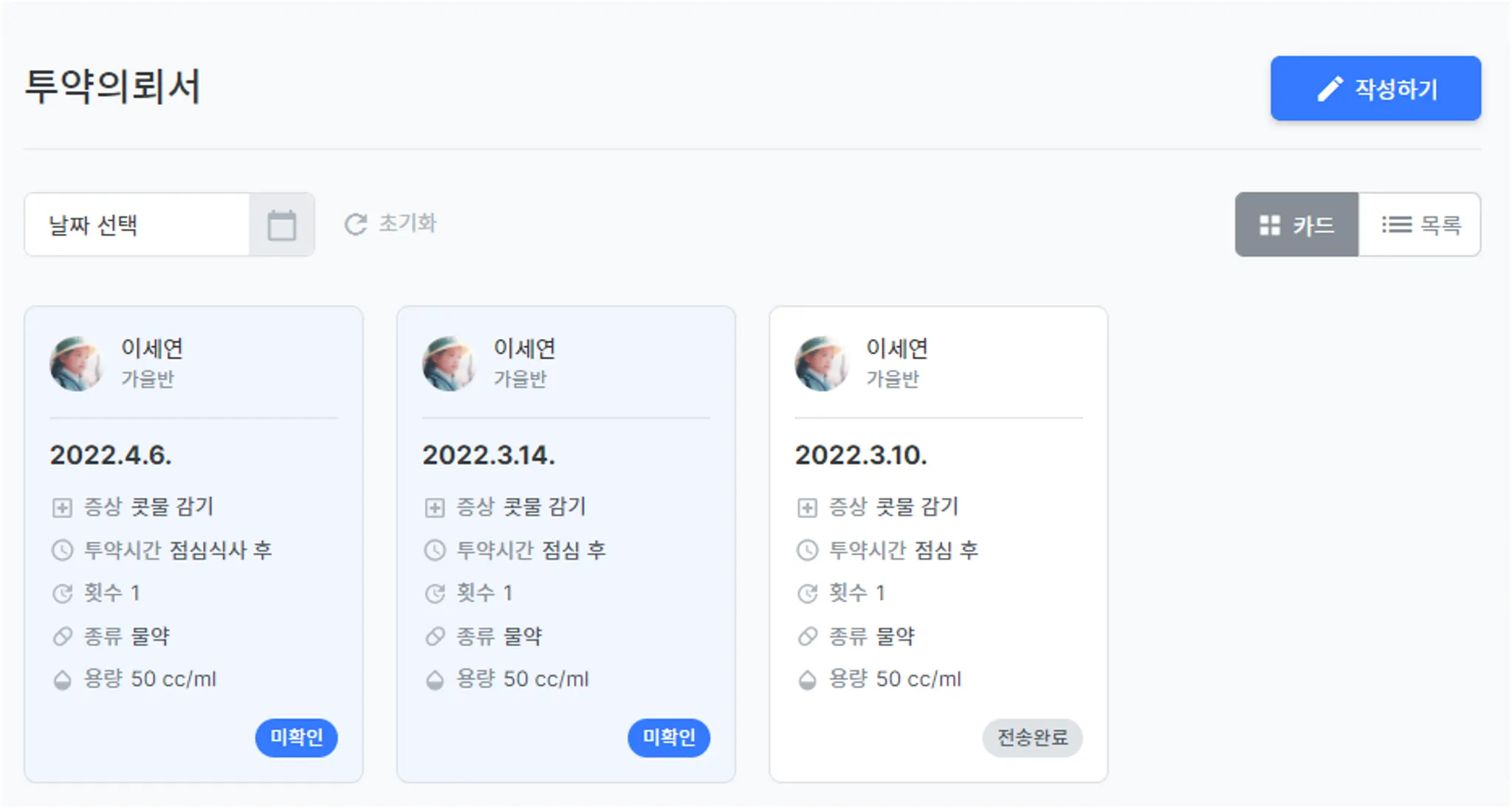 - 투약보고서 작성여부에 따라 미확인 혹은 전송완료 표시가 되어 구분하기가 쉽습니다.