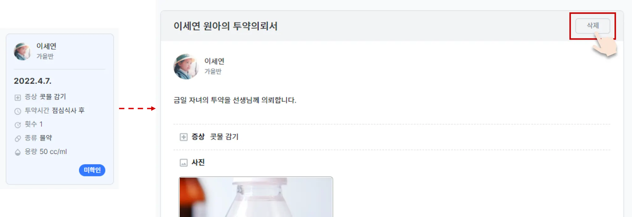 원에서 투약보고서를 작성하지 않은 투약의뢰서는 삭제가 가능합니다. 삭제하고 싶은 투약의뢰서는 상세화면 우측 상단의 삭제 버튼을 선택하고 삭제 처리 해주세요.