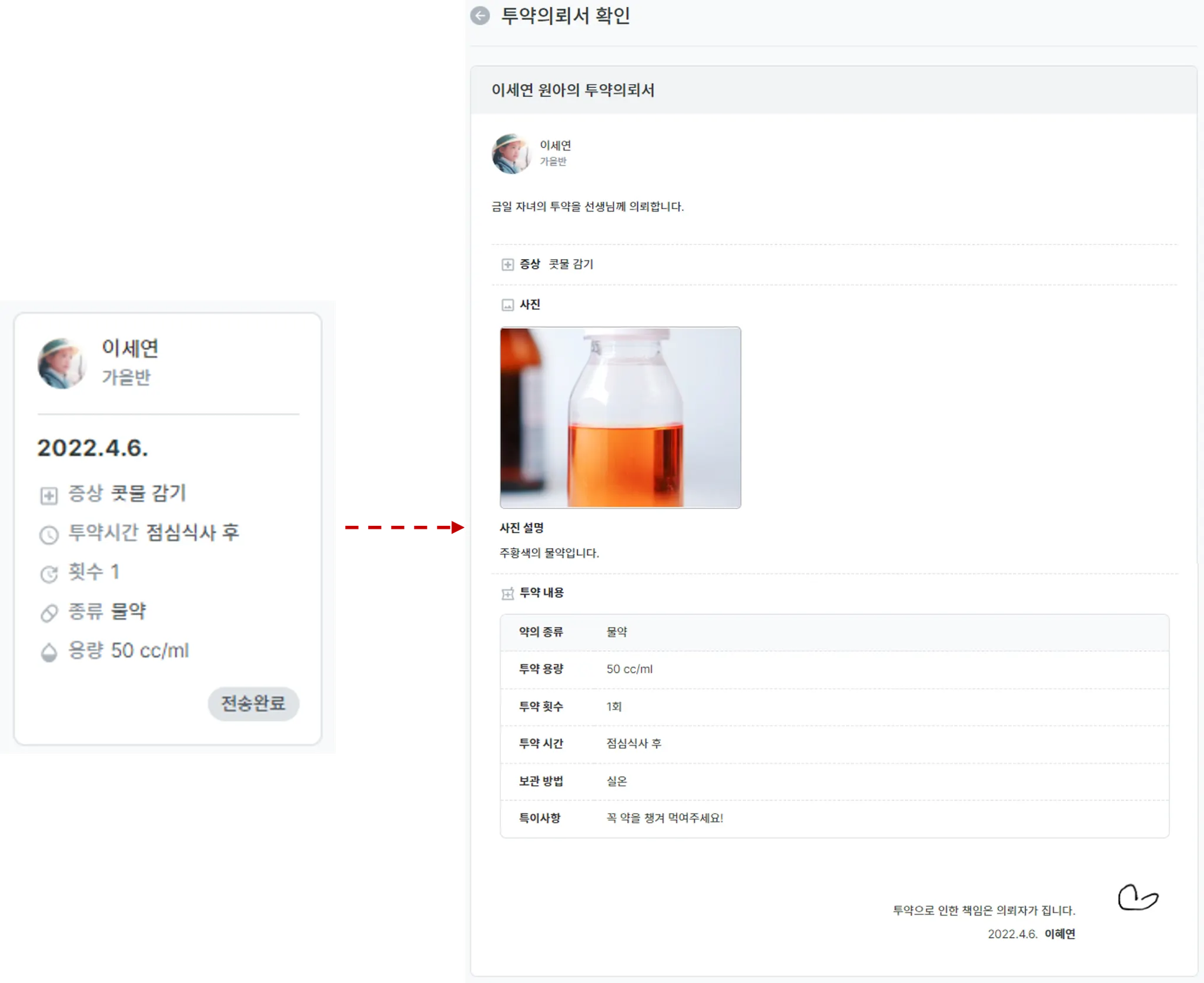 - 전송 완료된 투약의뢰서를 선택하면, 상세 페이지로 이동합니다.