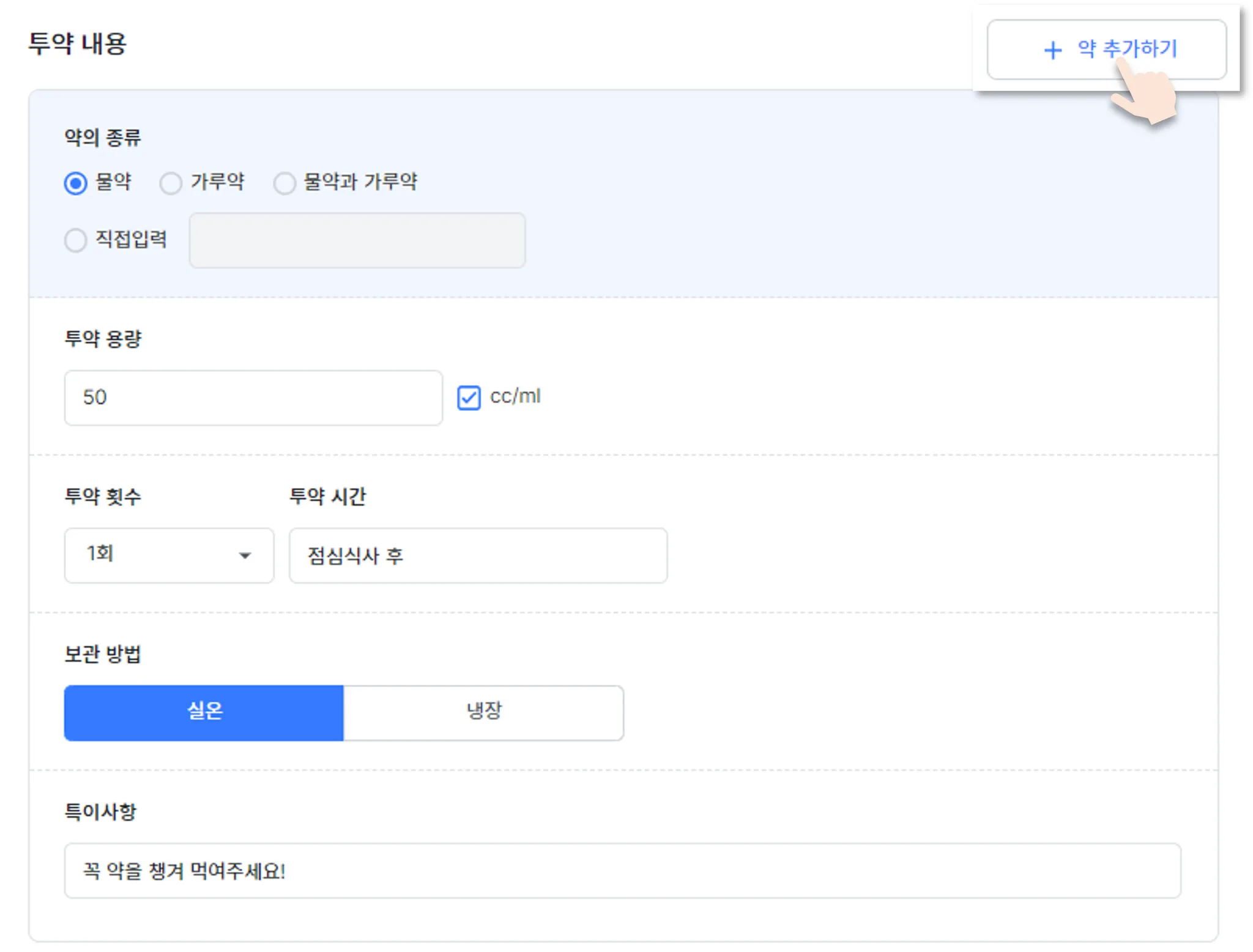 약의 종류, 투약 용량, 투약 횟수, 보관방법, 특이사항을 작성합니다. 투약할 약이 여러 종류인 경우, 약 추가하기를 클릭하여 약을 추가할 수 있습니다.