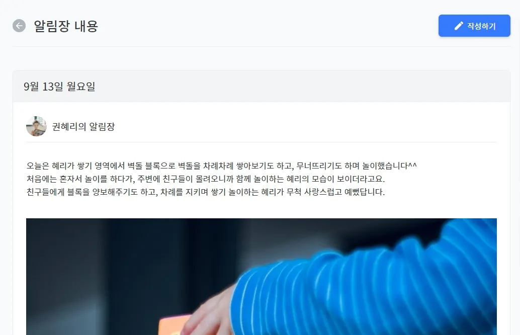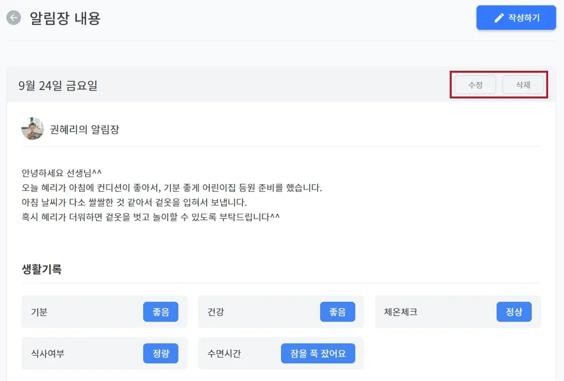 작성된 알림장은 알림장 목록에서 확인할 수 있으며, 수정/삭제가 가능합니다.