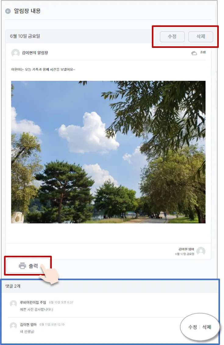 학부모님이 직접 작성하셨던 알림장 내용과 댓글은 수정 또는 삭제를 할 수 있습니다.