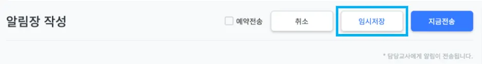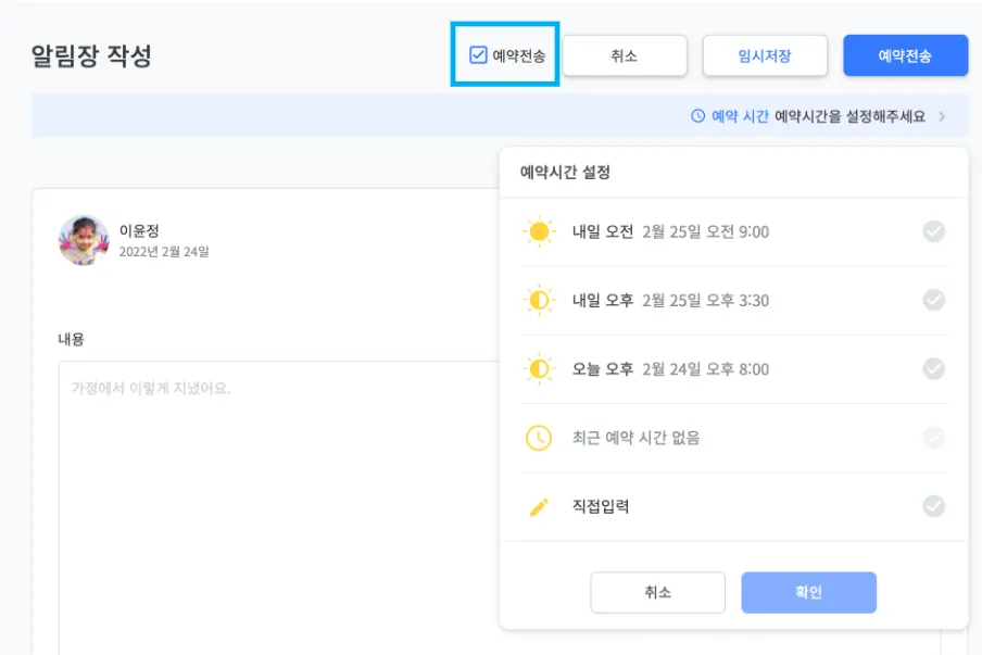 알림장 즉시 발송을 원하지 않는 경우, 전송 옵션 기능 임시저장, 예약전송을 활용해주세요. 특히 늦은 시간에 알림장을 작성하셨다면, 예약 전송 기능을 활용해주세요