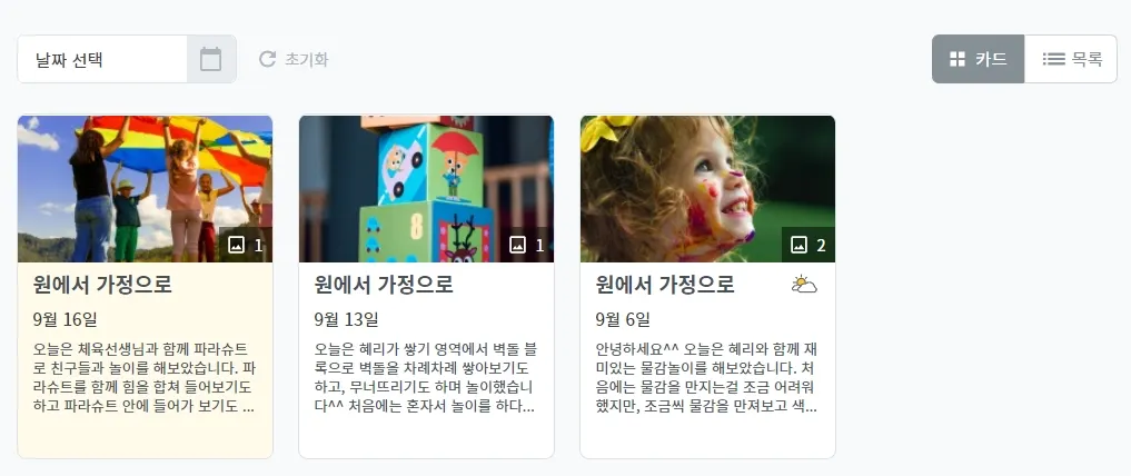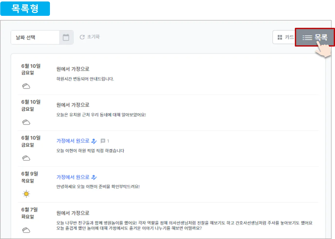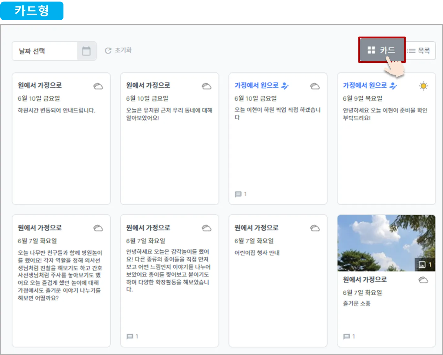 - 월별/일별로 알림장 목록을 볼 수 있으며, 카드형/목록형 2가지 형태로 알림장 목록을 확인할 수 있습니다.