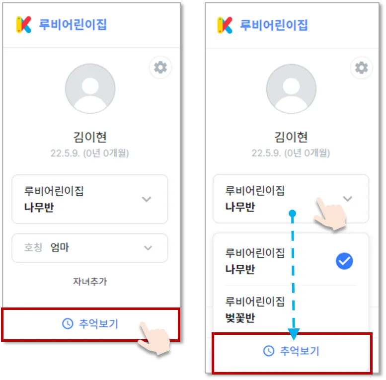 - 왼쪽 사이드 메뉴에서 추억보기 버튼을 클릭하시거나 아이 소속을 선택하는 스크롤 하단에서 추억보기를 클릭합니다.
