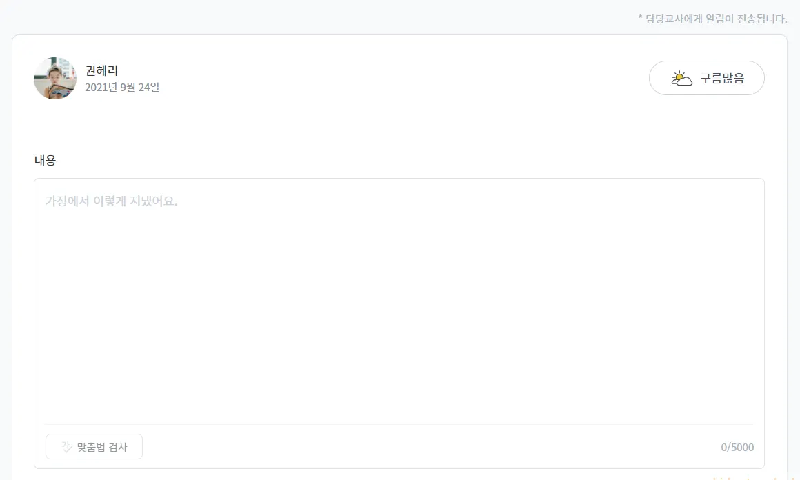 알림장 작성 시점의 날씨를 체크하고, 알림장의 내용(최대 5000자)을 작성해주세요.