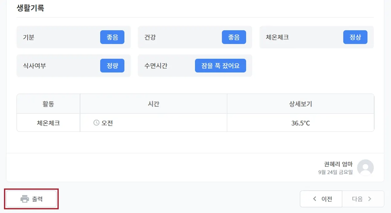 - 하단에 출력 버튼을 통해 해당 알림장을 출력할 수 있습니다.