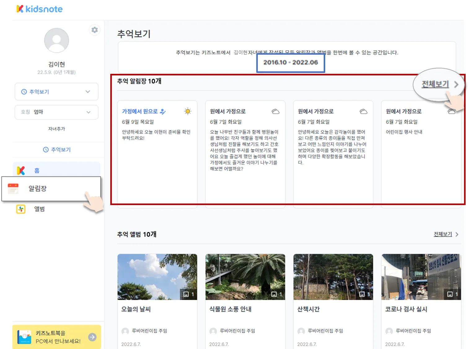 좌측 목록에서 알림장을 선택하거나 추억 알림장 우측에 전체보기를 클릭 시 자녀가 소속되어 있던 모든 반의 알림장과 앨범이 확인 가능 합니다.