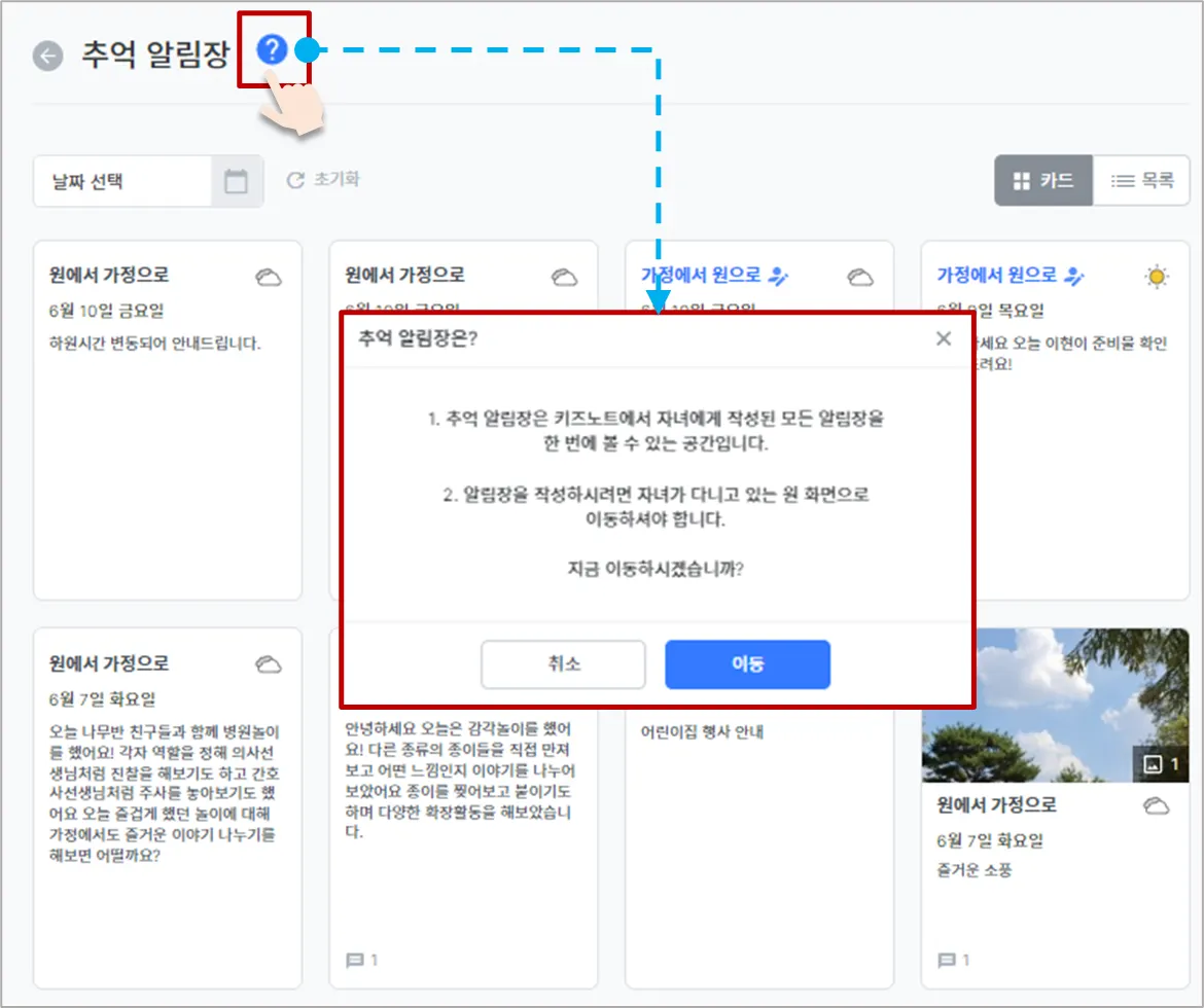 )을 클릭하면 추억 알림장 안내 팝업을 확인할 수 있습니다.