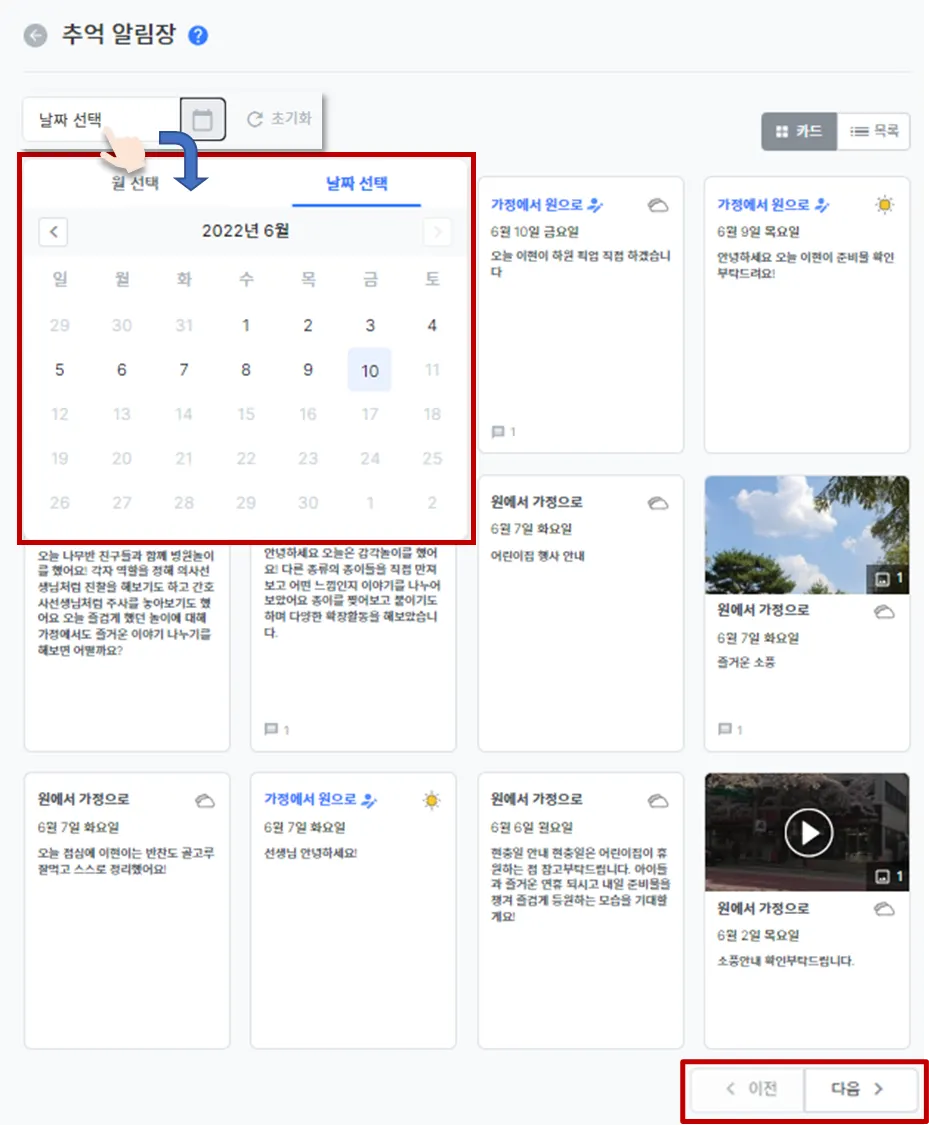 - 상단에 해당 자녀의 추억보기 조회가 가능한 날짜를 확인하실 수 있습니다.