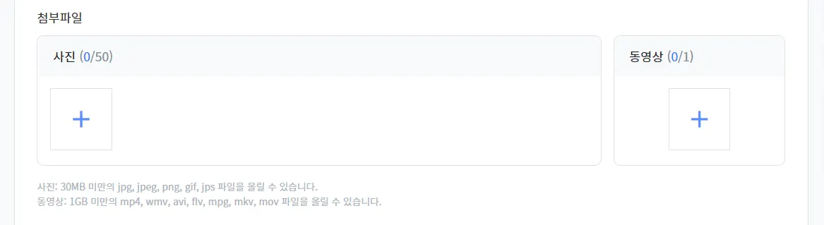 - 첨부파일 개수 : 사진 최대 50장, 동영상 1개(단, 동영상과 동시 업로드 시 사진은 최대 49장까지 업로드 가능)