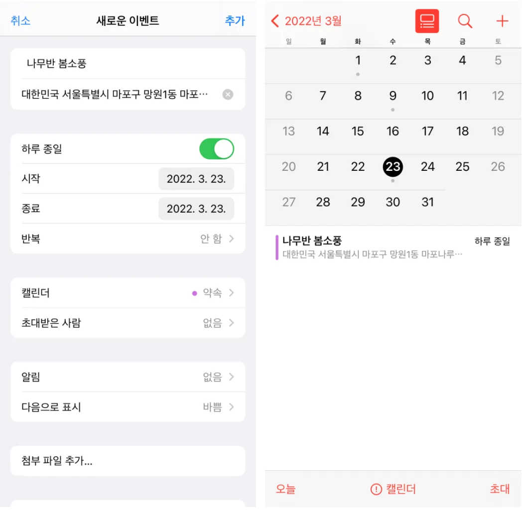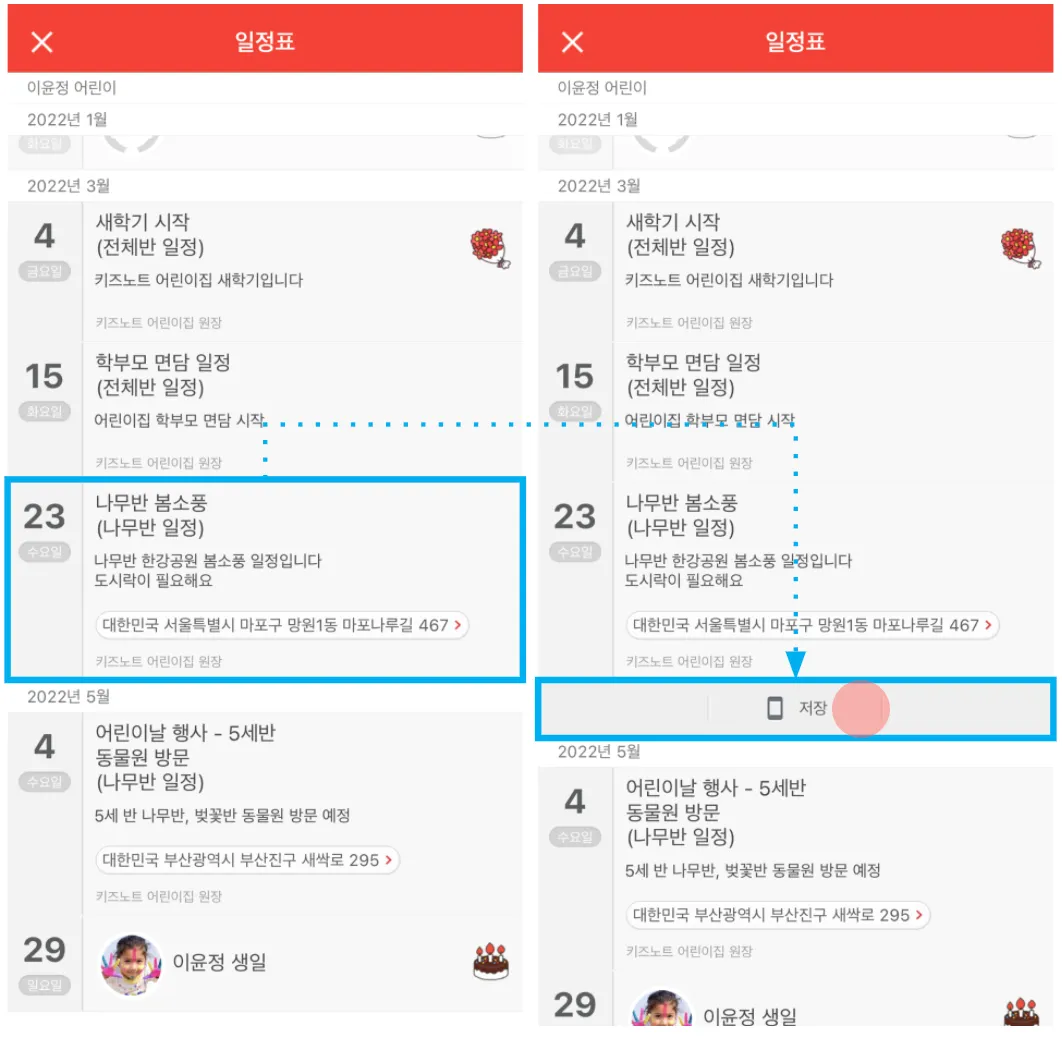 저장 버튼을 선택하면 키즈노트에 등록되어 있던 일정이 나의 휴대폰 캘린더로 연동되어, 동일한 내용을 쉽게 저장할 수 있습니다.