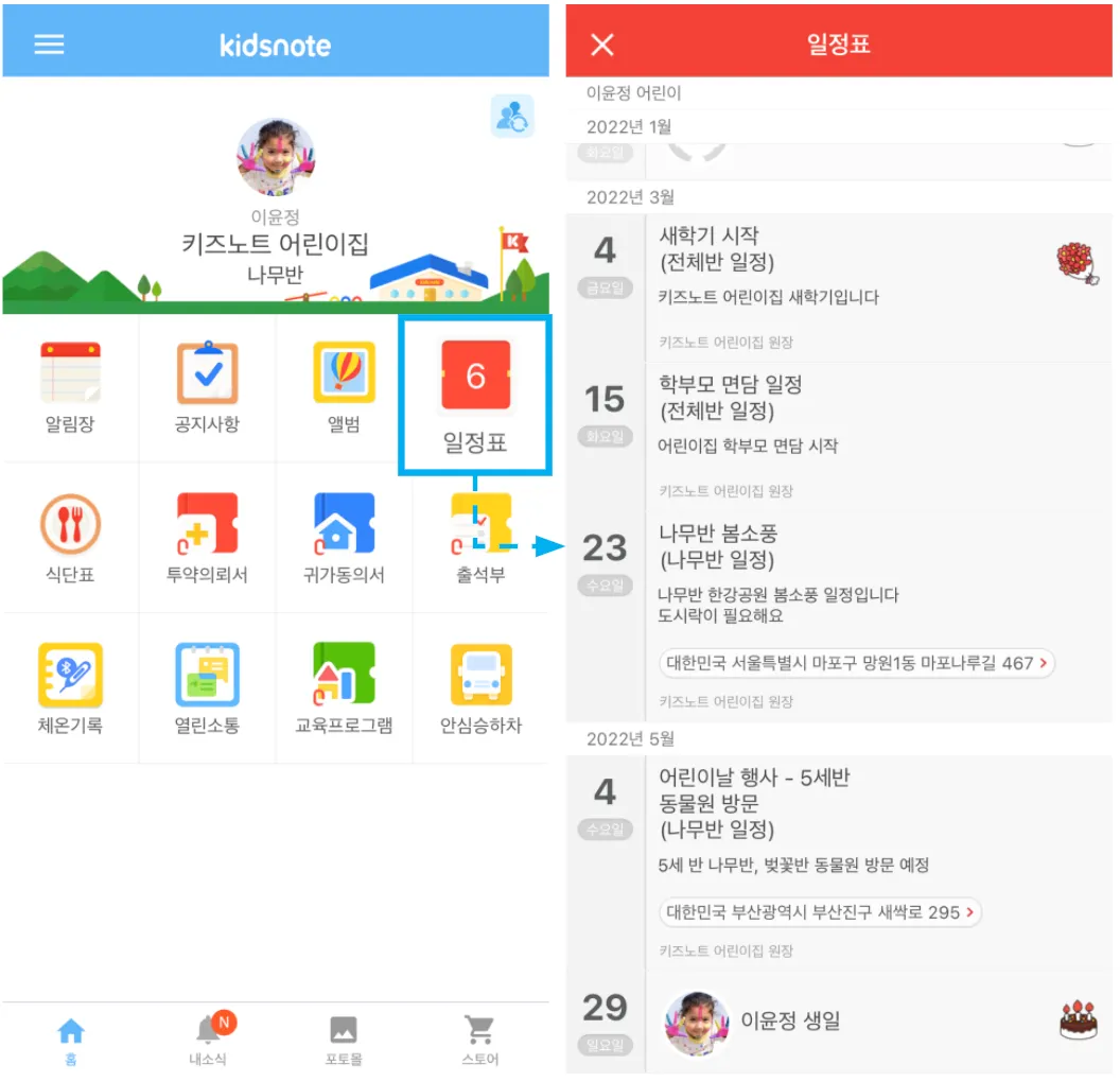 일정표를 통해서는 원의 주요 일정과 우리 아이 및 아이가 속한 반 친구들의 생일을 확인할 수 있습니다. 저장 기능을 통해 원의 일정을 휴대폰 캘린더에 저장할 수 있습니다.