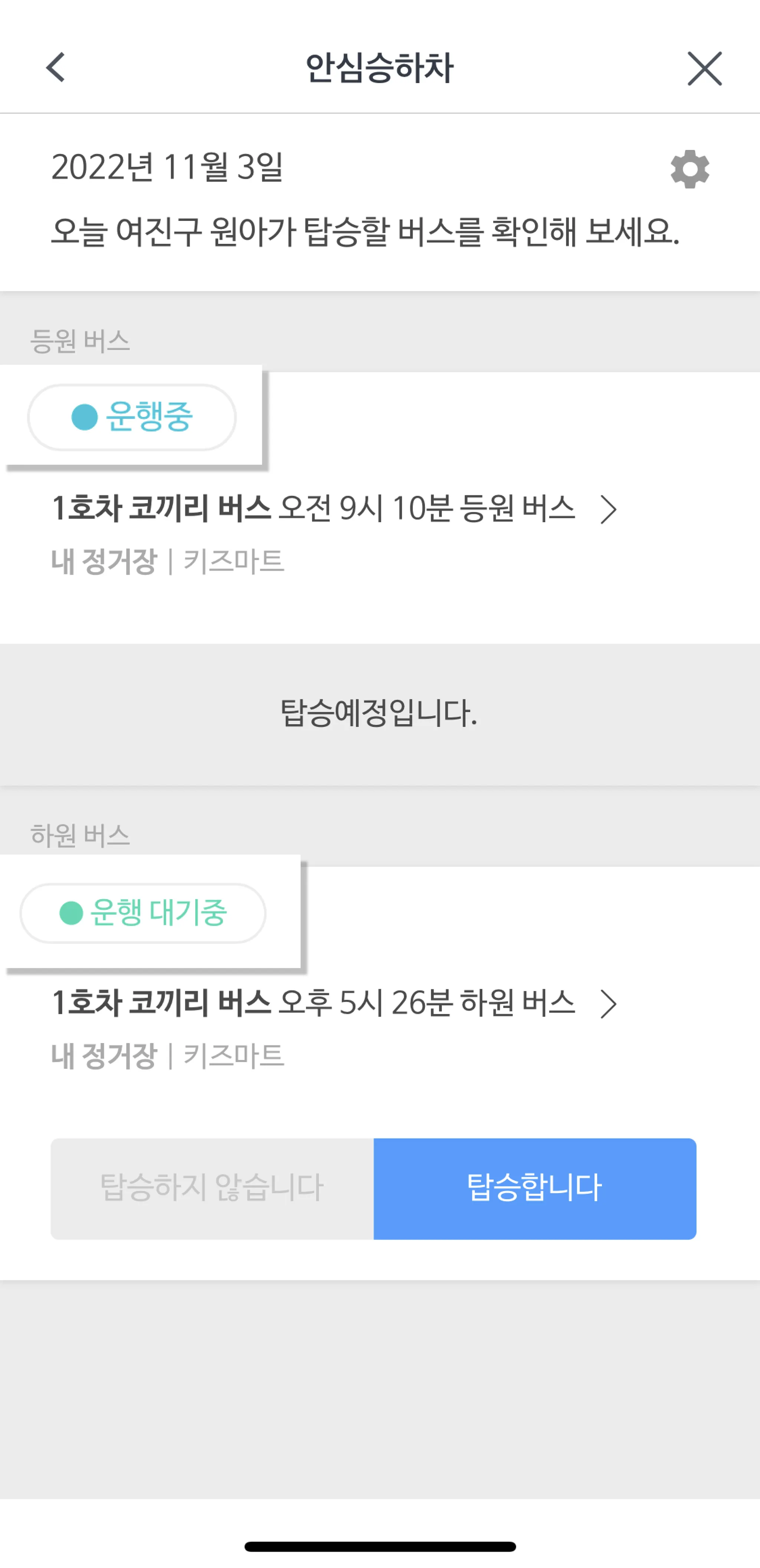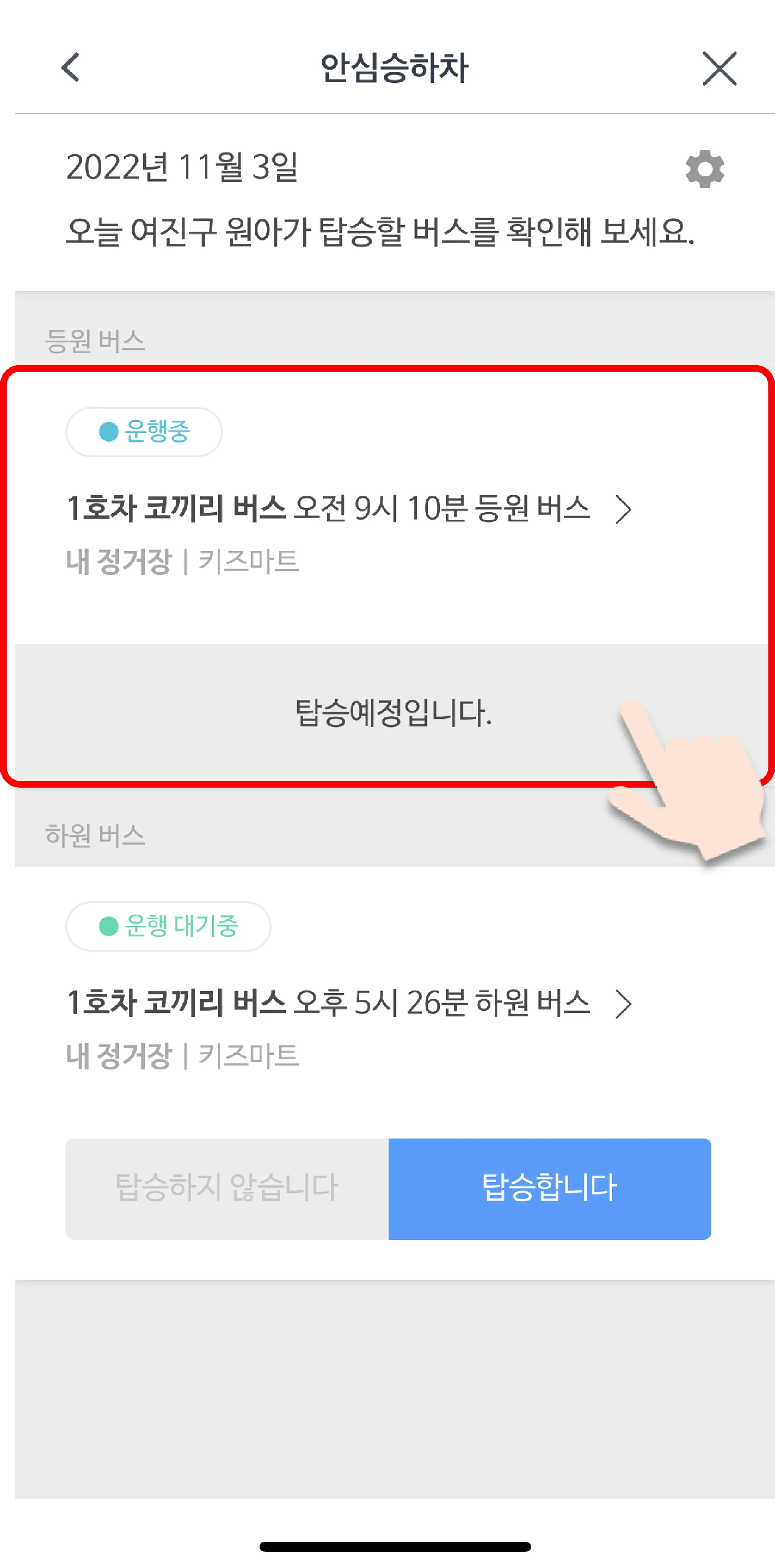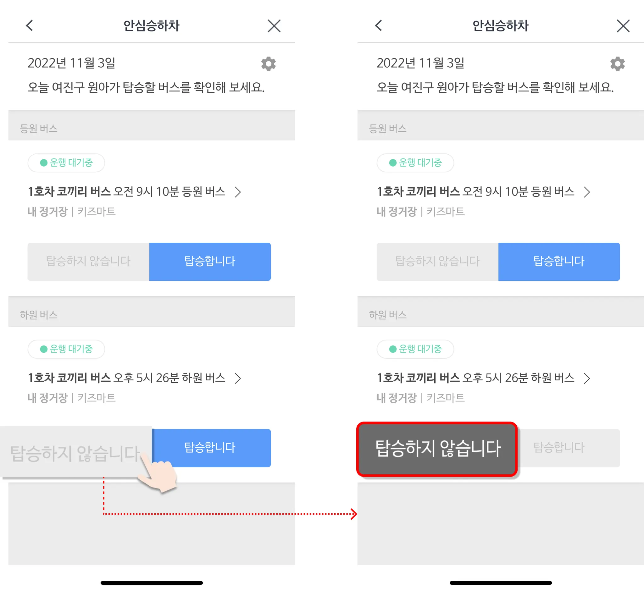 당일 운행 대기 중인 차량만 탑승 여부를 변경할 수 있습니다. 버스를 탑승 하지 않을 경우, 탑승하지 않습니다를 선택하면 원으로 전달됩니다.