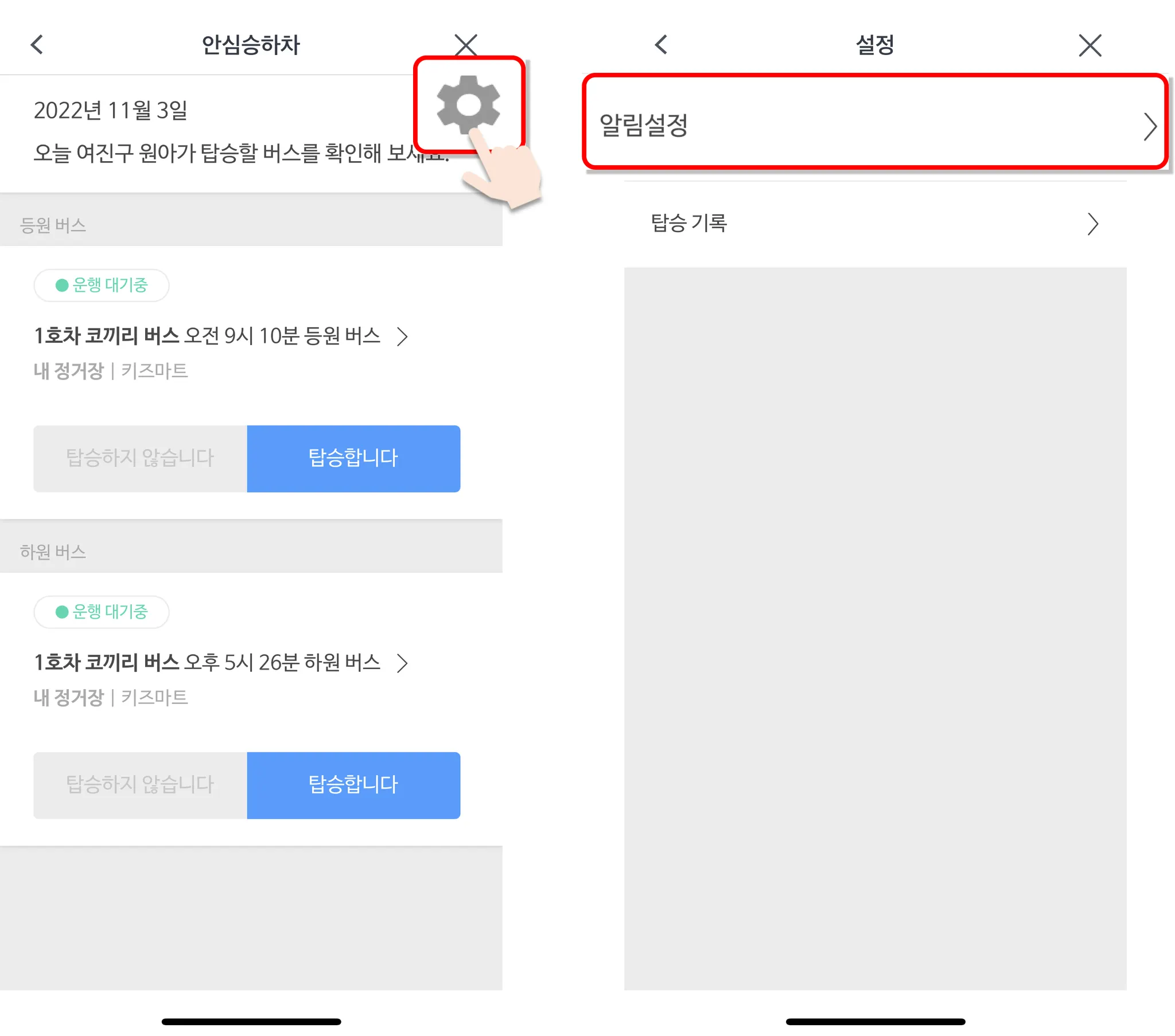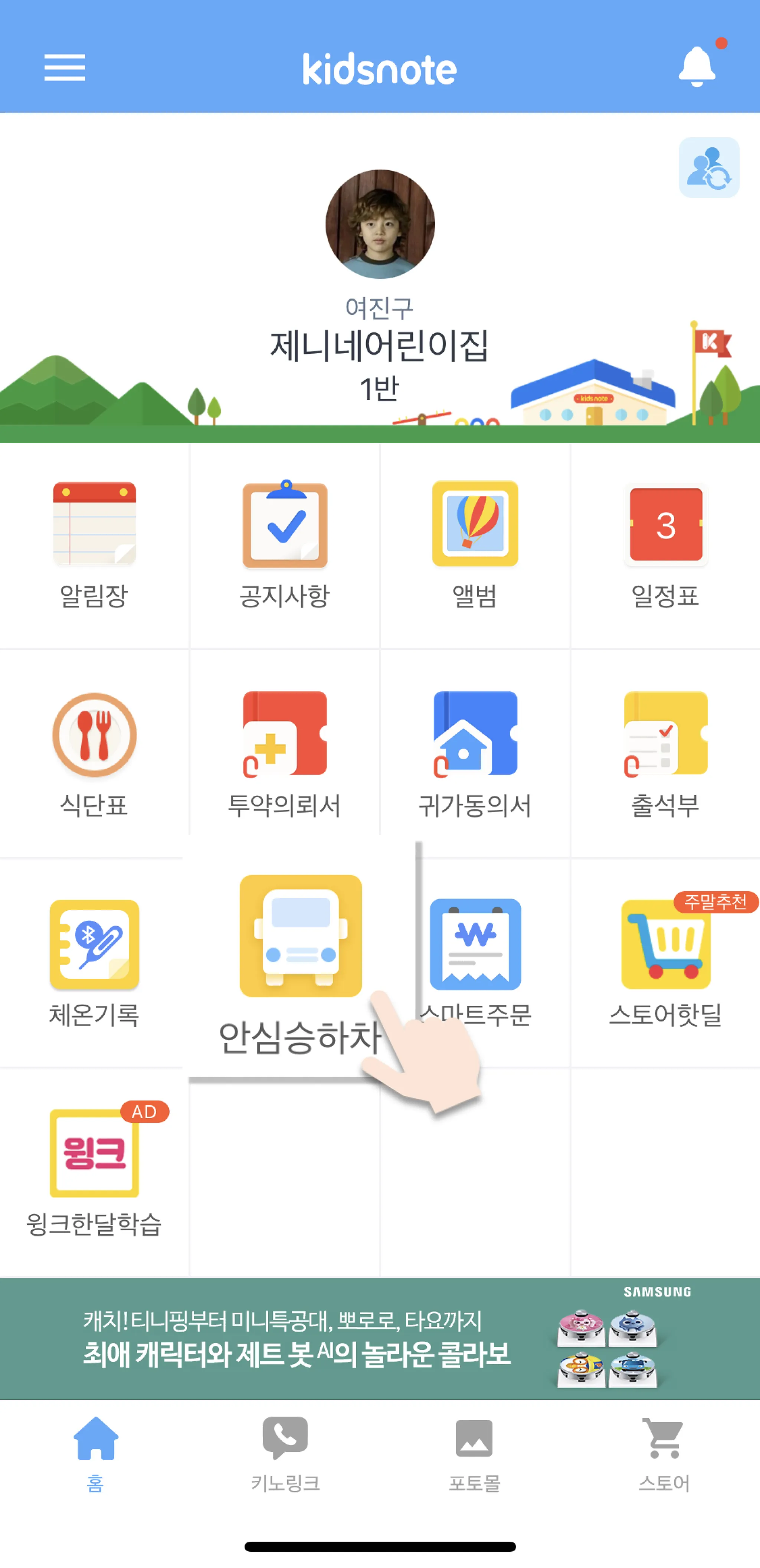 키즈노트 APP에서 안심승하차 메뉴를 선택합니다.