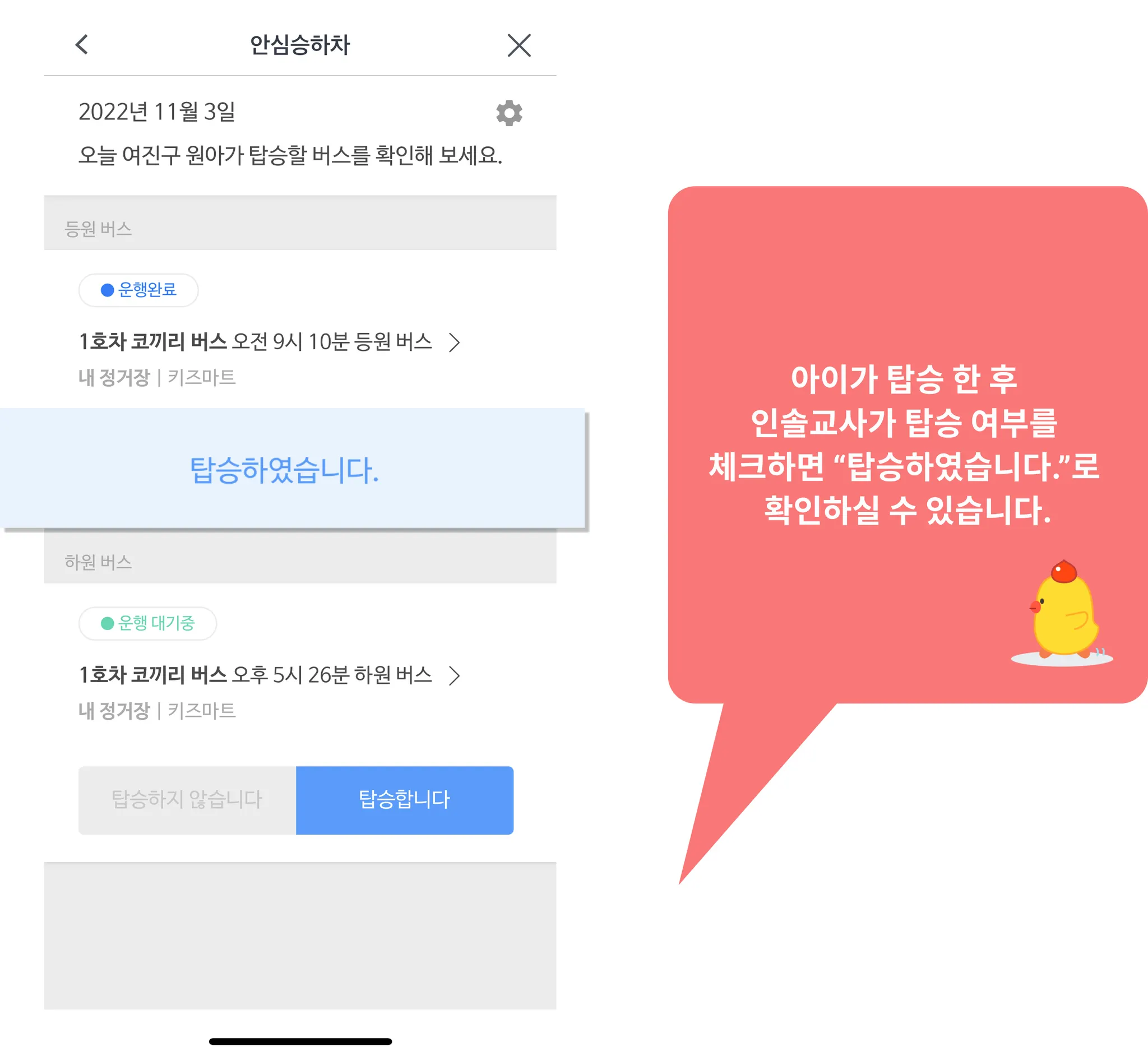 우리 아이의 승차부터 하차까지 한번에 확인이 가능하여 아이를 안심하고 보낼 수 있는 서비스입니다.