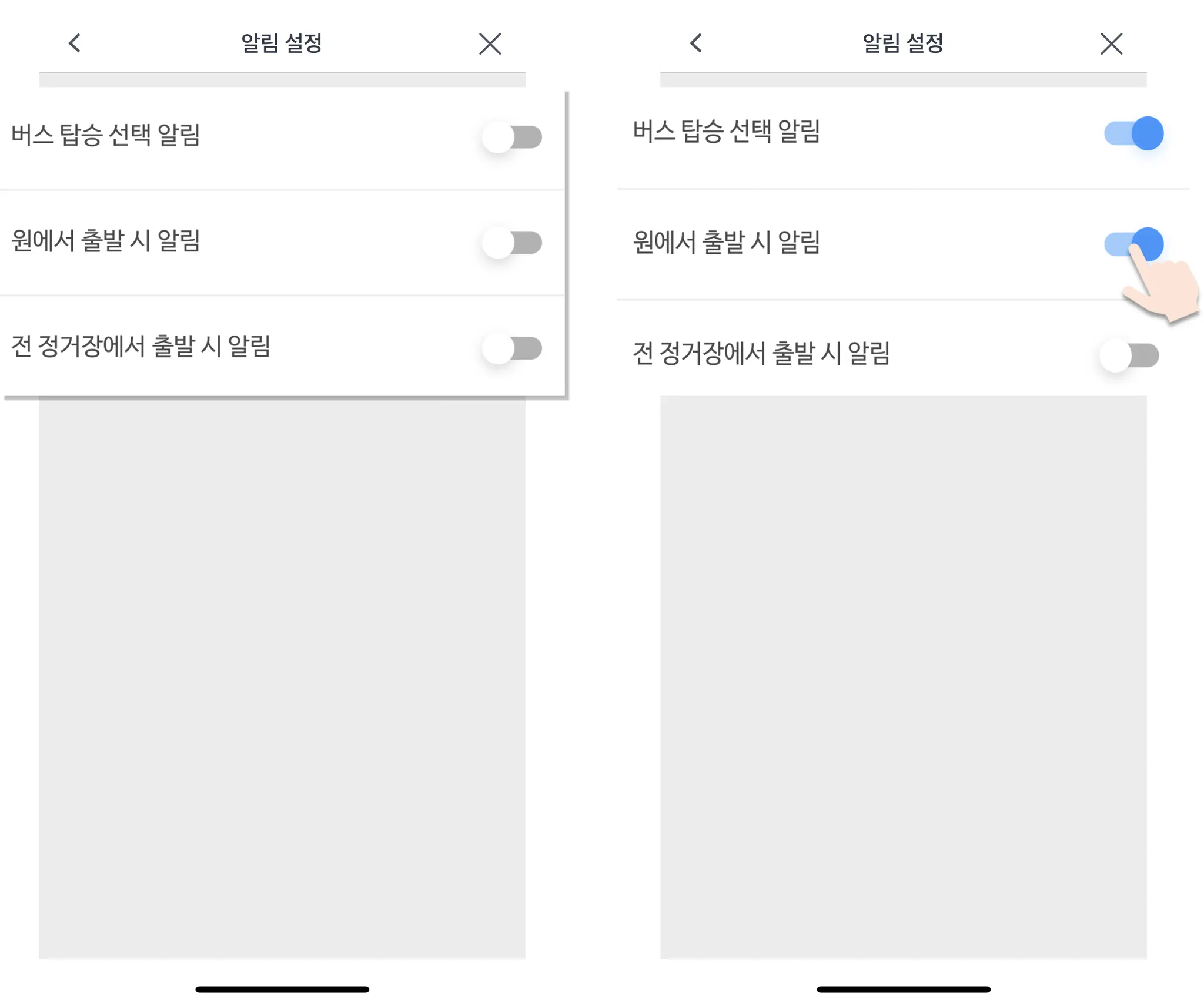 버스 탑승 여부, 원에서 출발, 전 정거장에서 출발 시 중에 받고 싶은 알림을 켜주시면 승하차 준비를 편리하게 할 수 있습니다.