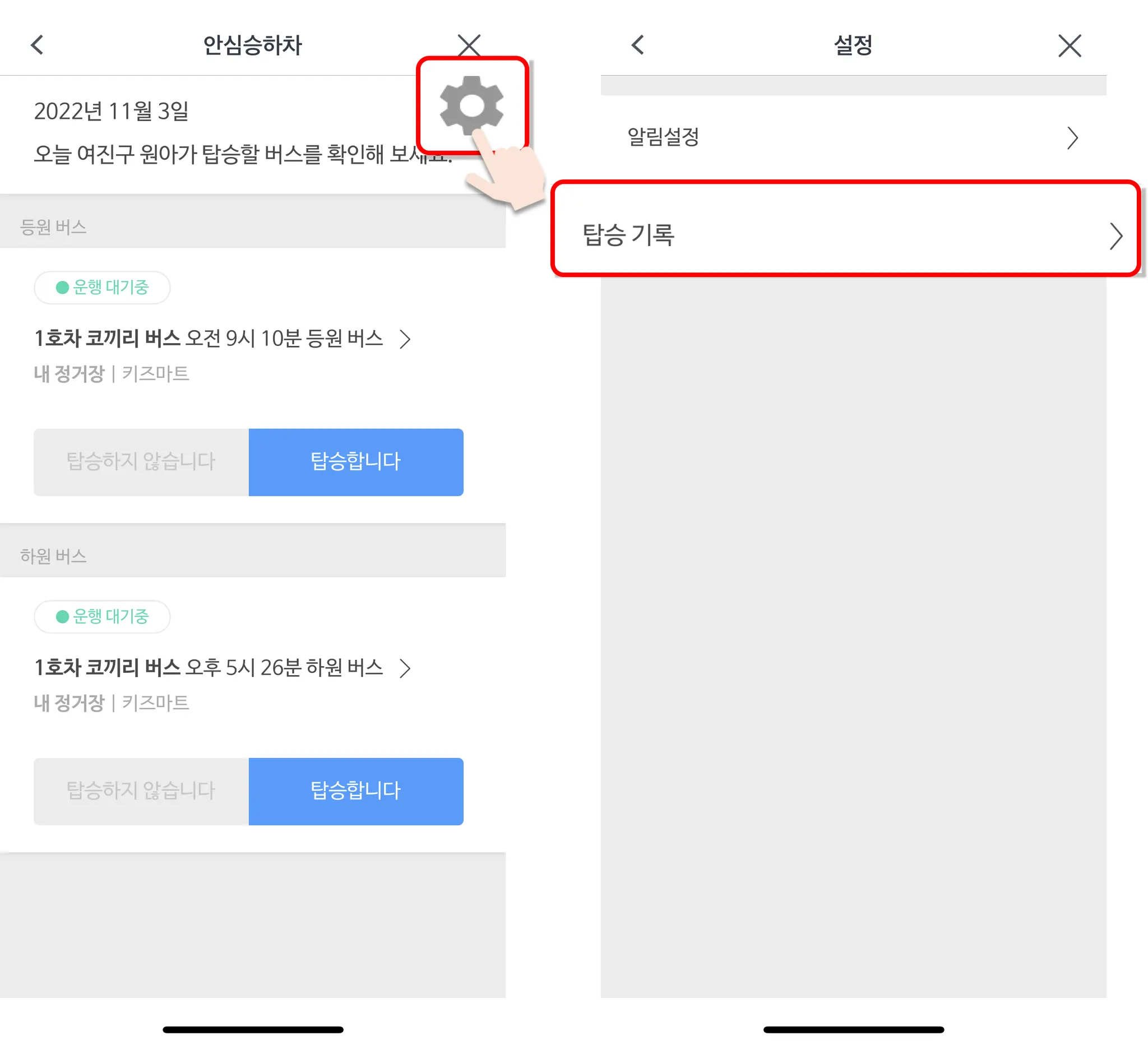 톱니바퀴 아이콘을 클릭하여, 탑승 기록 메뉴를 선택합니다.