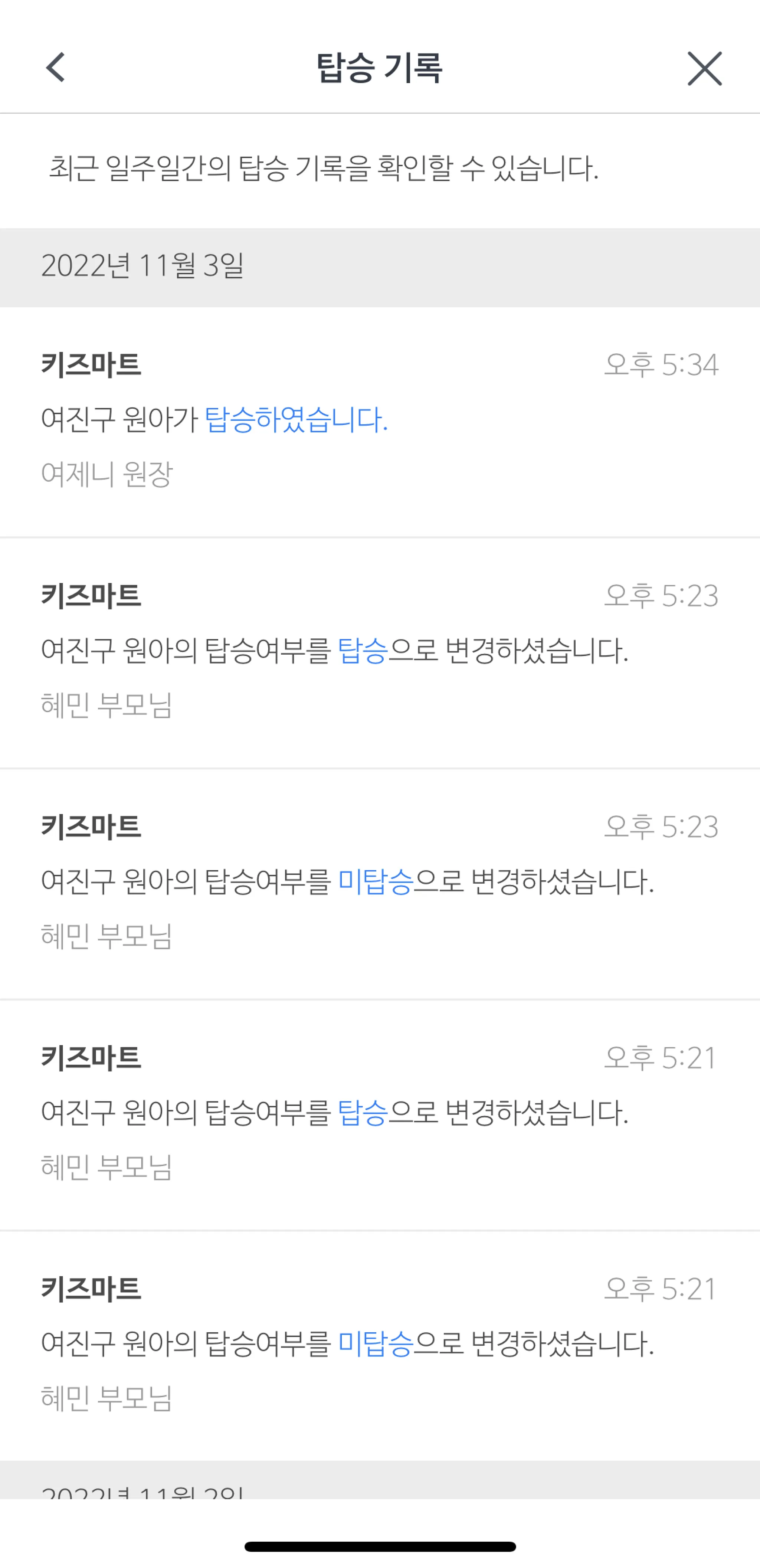 최근 일주일간의 탑승 정거장 및 탑승 시간 등을 확인할 수 있습니다.