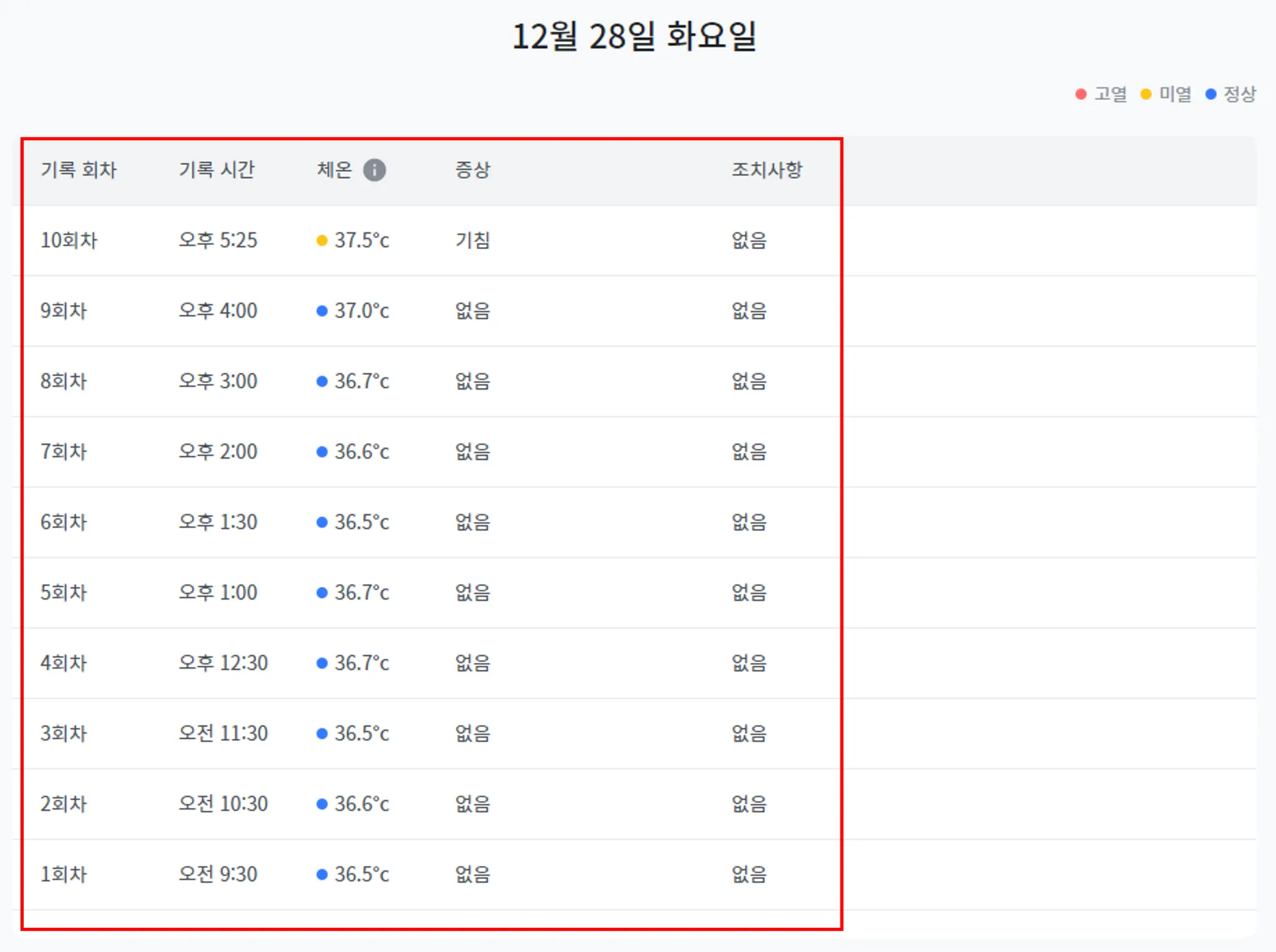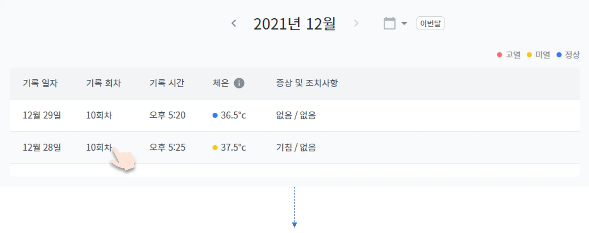 체온기록 목록에서 확인하고 싶은 체온기록을 선택하면, 상세 페이지에서 입력된 회차별 체온 기록과 내용을 확인할 수 있습니다.