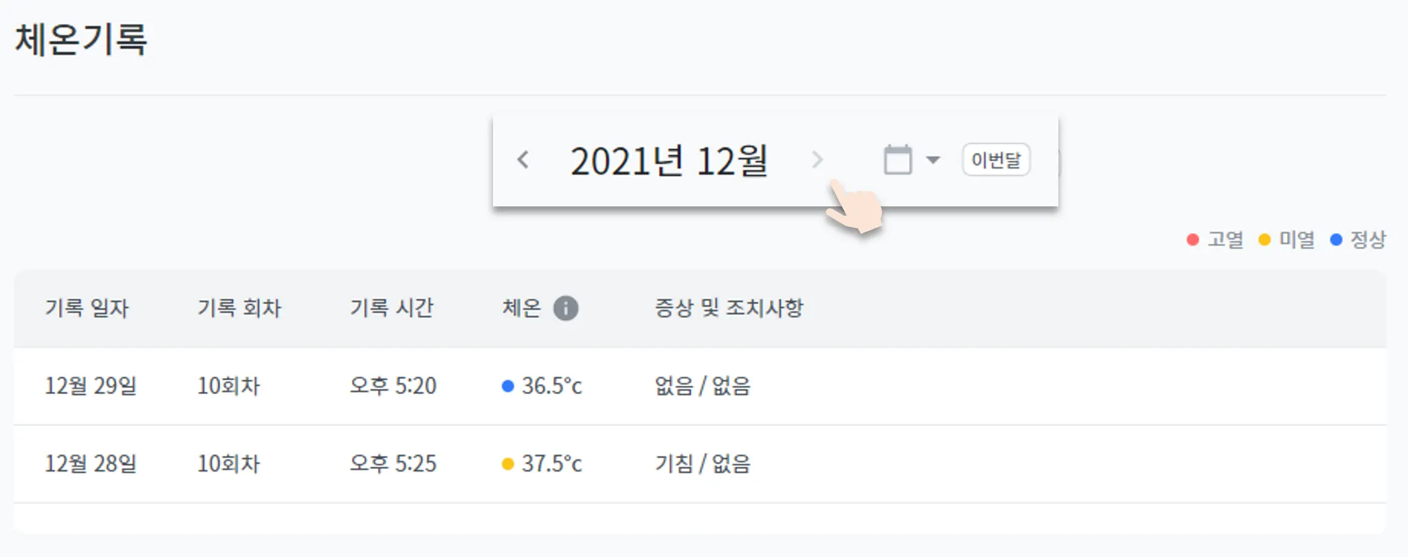 - 체온 기록 날짜는 당월 기준으로 표시되며, 날짜 변경시 과거로만 이동할 수 있습니다.