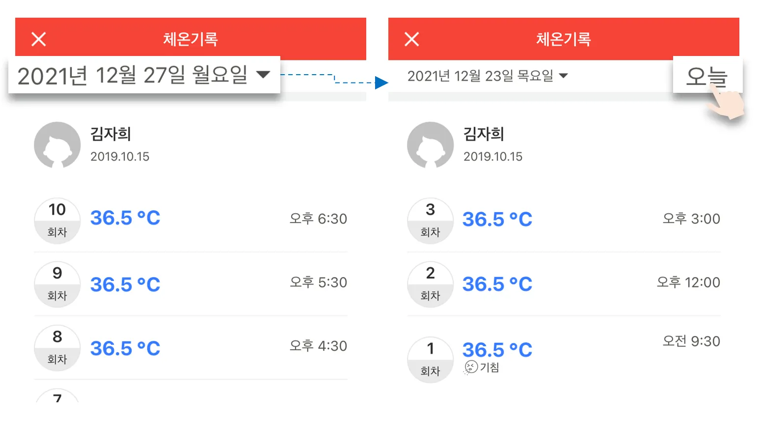 - 날짜 변경시 우측에 ‘오늘’ 탭이 나타나고, 선택하면 당일 체온 기록 목록으로 이동합니다.