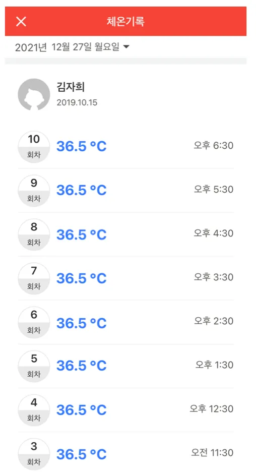 - 체온기록은 총 10회까지 기록되며, 회차별로 기록된 체온, 시간을 확인할 수 있습니다.