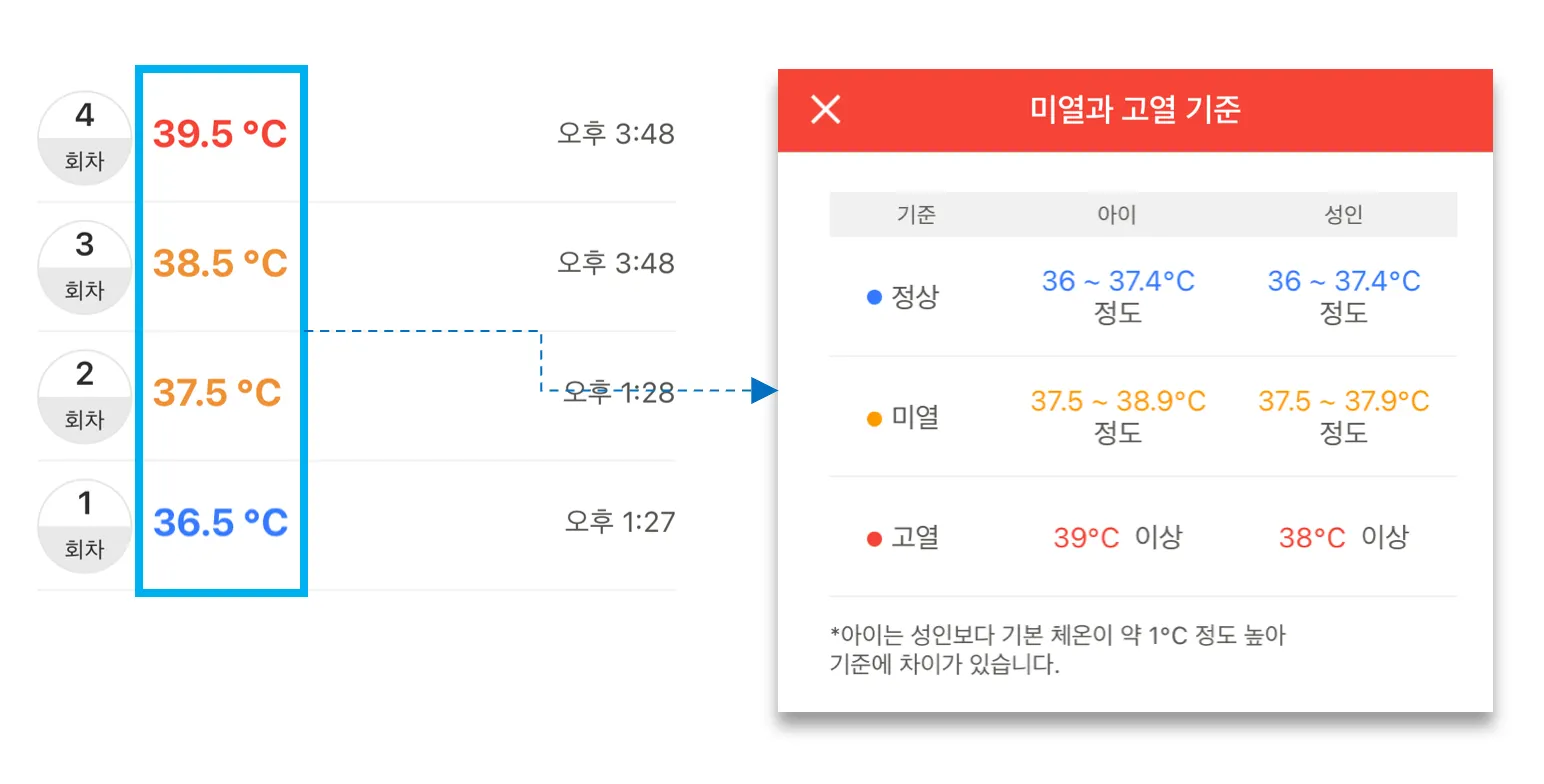 체온 기록 확인시 체온 기준에 따라 색깔이 표시되어 나타납니다.