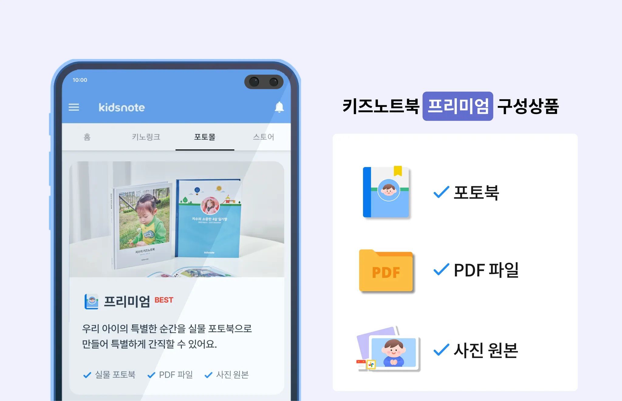 키즈노트에 가득한 아이의 사진과 영상을 실물 포토북, PDF 파일, 원본 파일로 간직할 수 있어요!