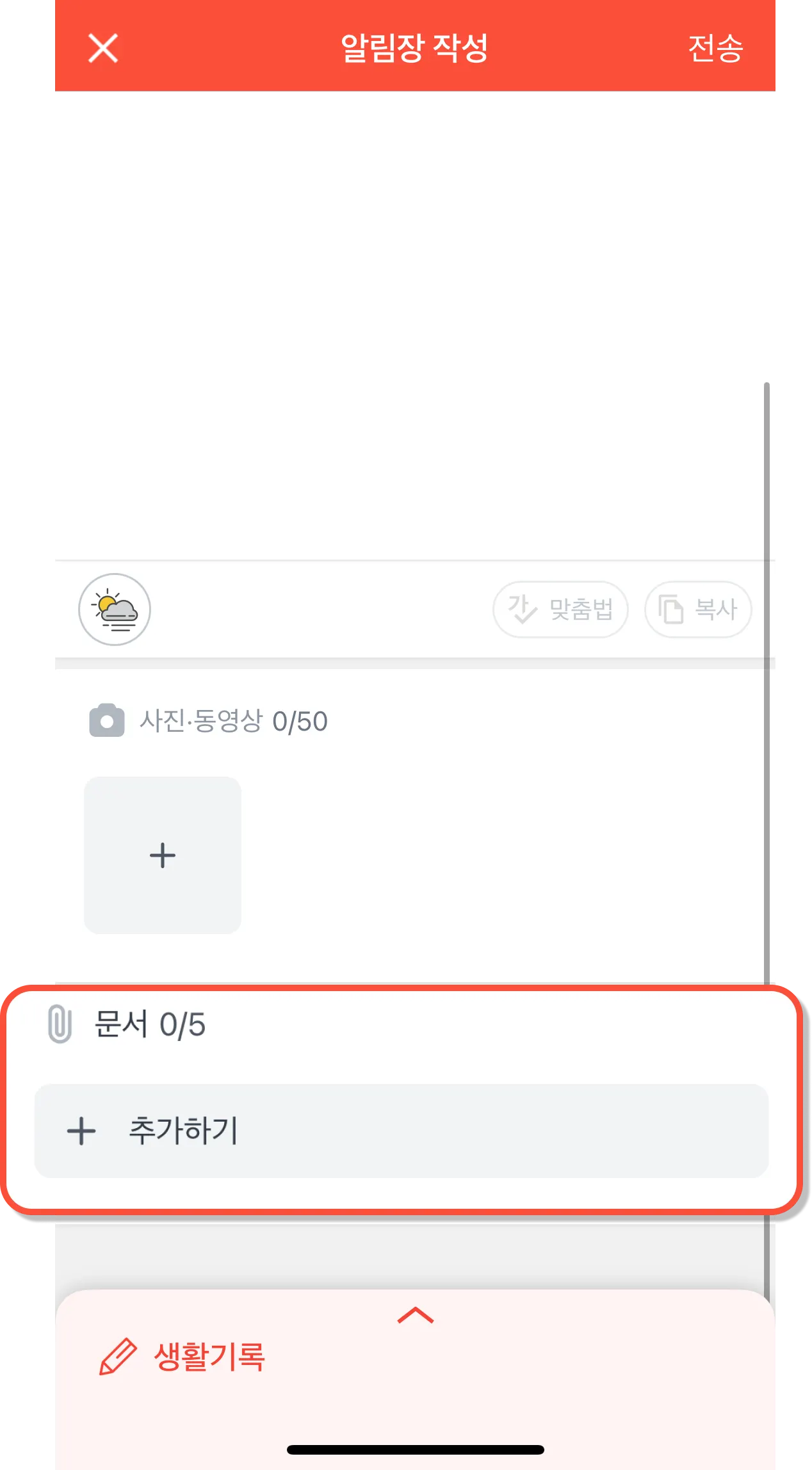 만약 앱에서 문서 첨부 영역이 보이지 않으신다면, 앱이 최신 버전인지 확인해 주세요.