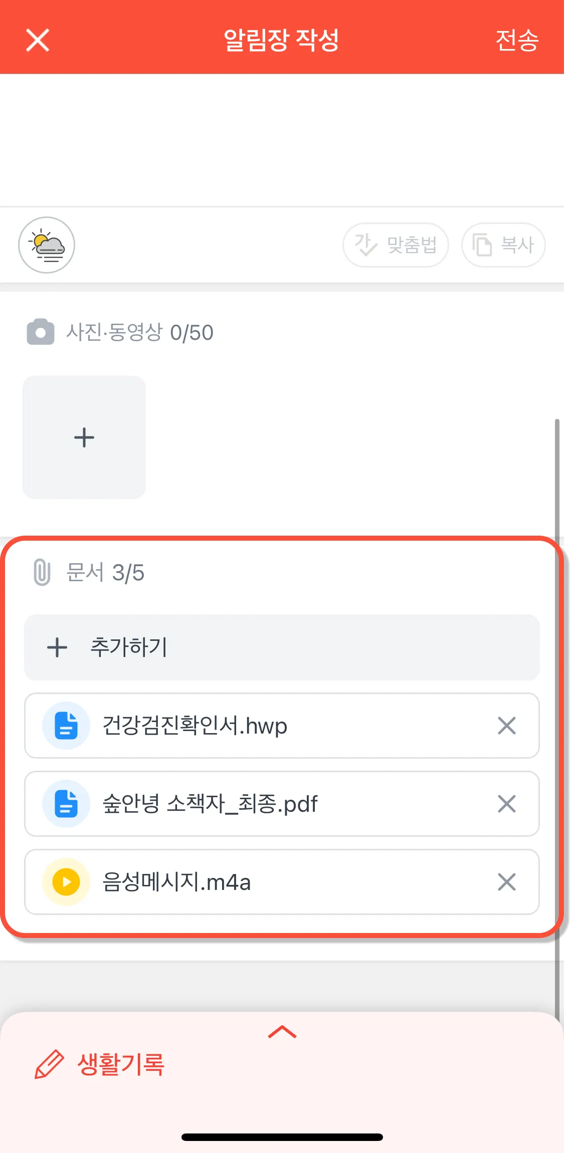 키즈노트에서 보다 편리하게 소통하실 수 있도록 파일 첨부 기능이 추가되었어요.