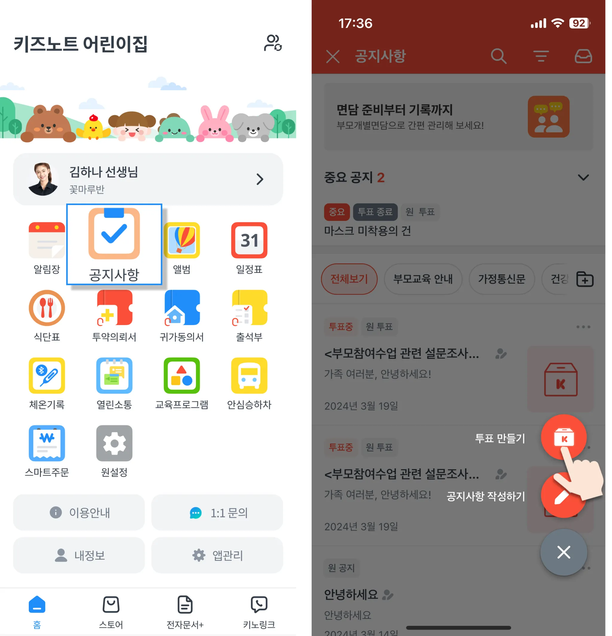 키즈노트 공지사항 메뉴 -> 투표 만들기를 선택합니다.