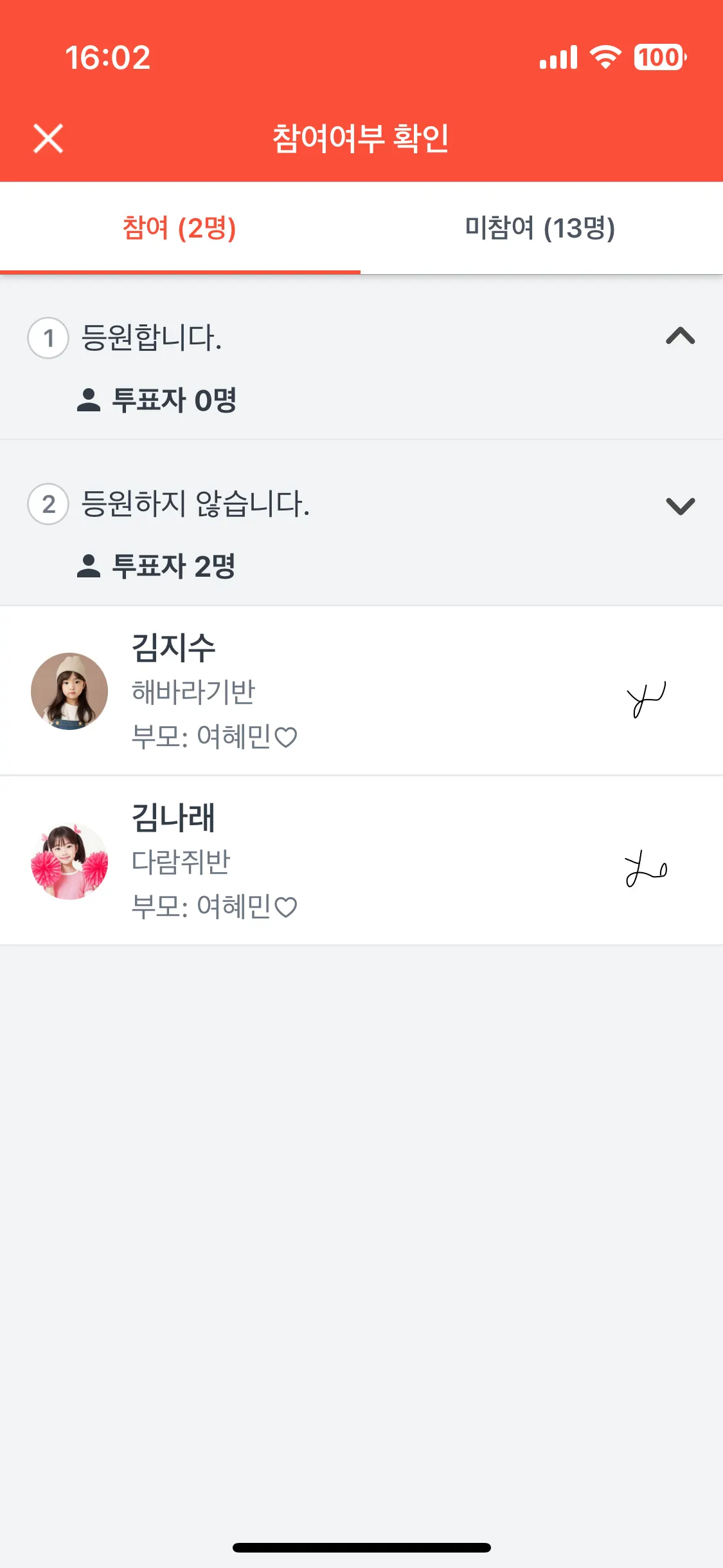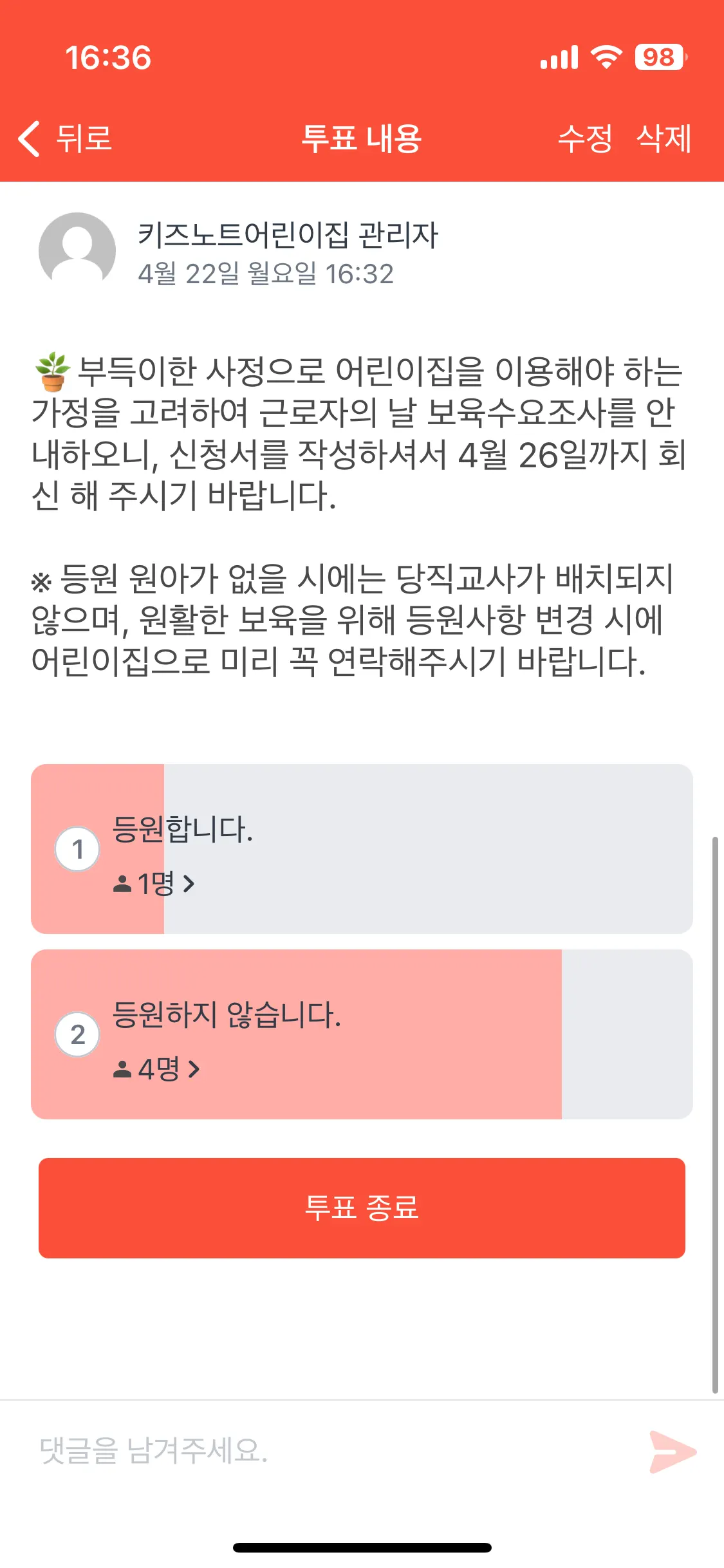 투표의 결과를 확인하고, 안내가 필요할 경우에는 등원 및 긴급(통합)보육 등에 대한 안내를 하도록 합니다.
