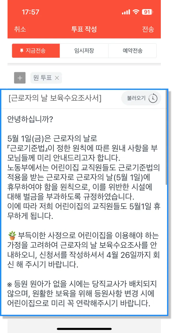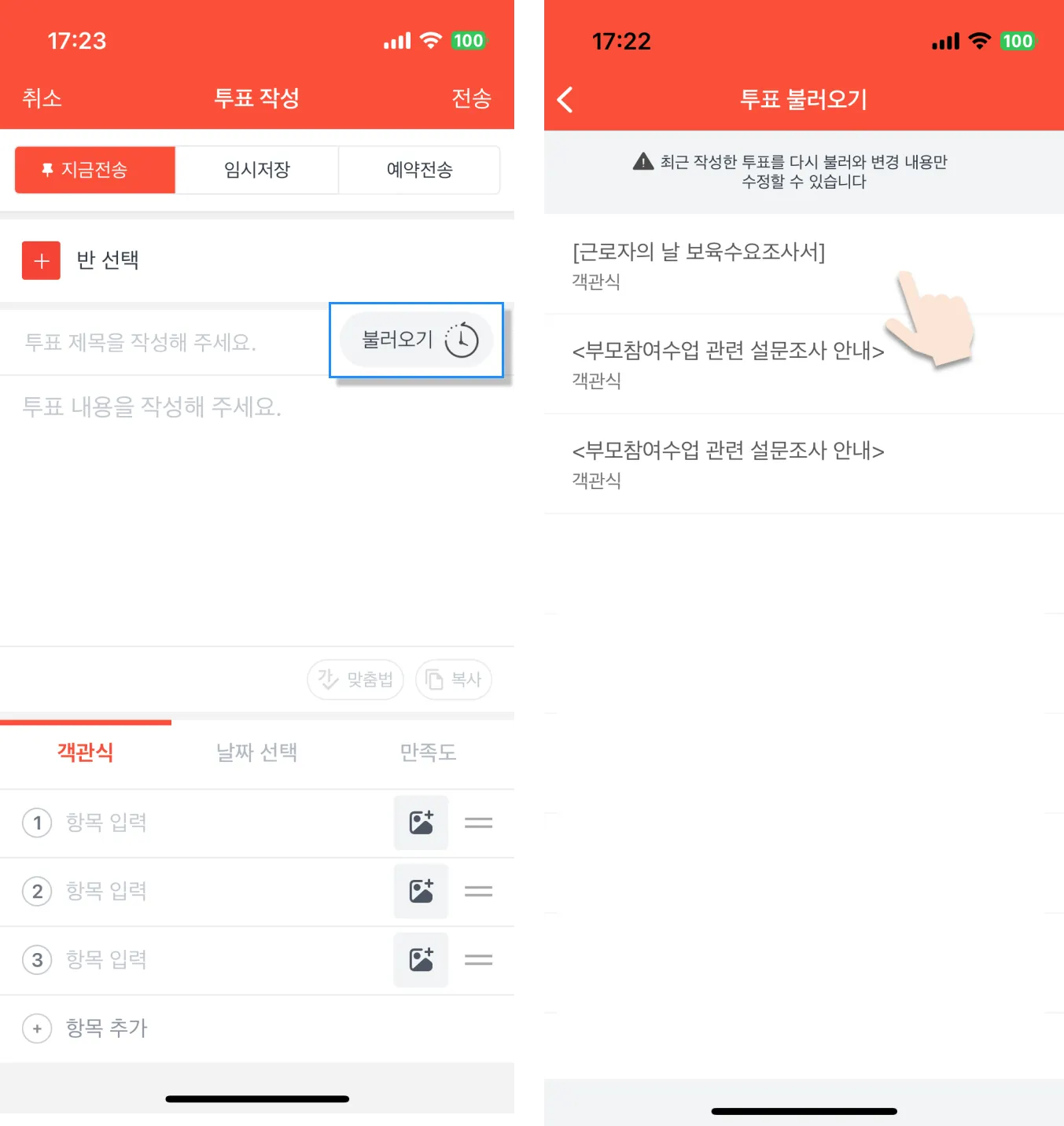 불러오기를 통해서는 최근 작성한 투표의 제목과 내용, 투표 항목을 그대로 불러와 필요한 내용만 수정할 수 있습니다.