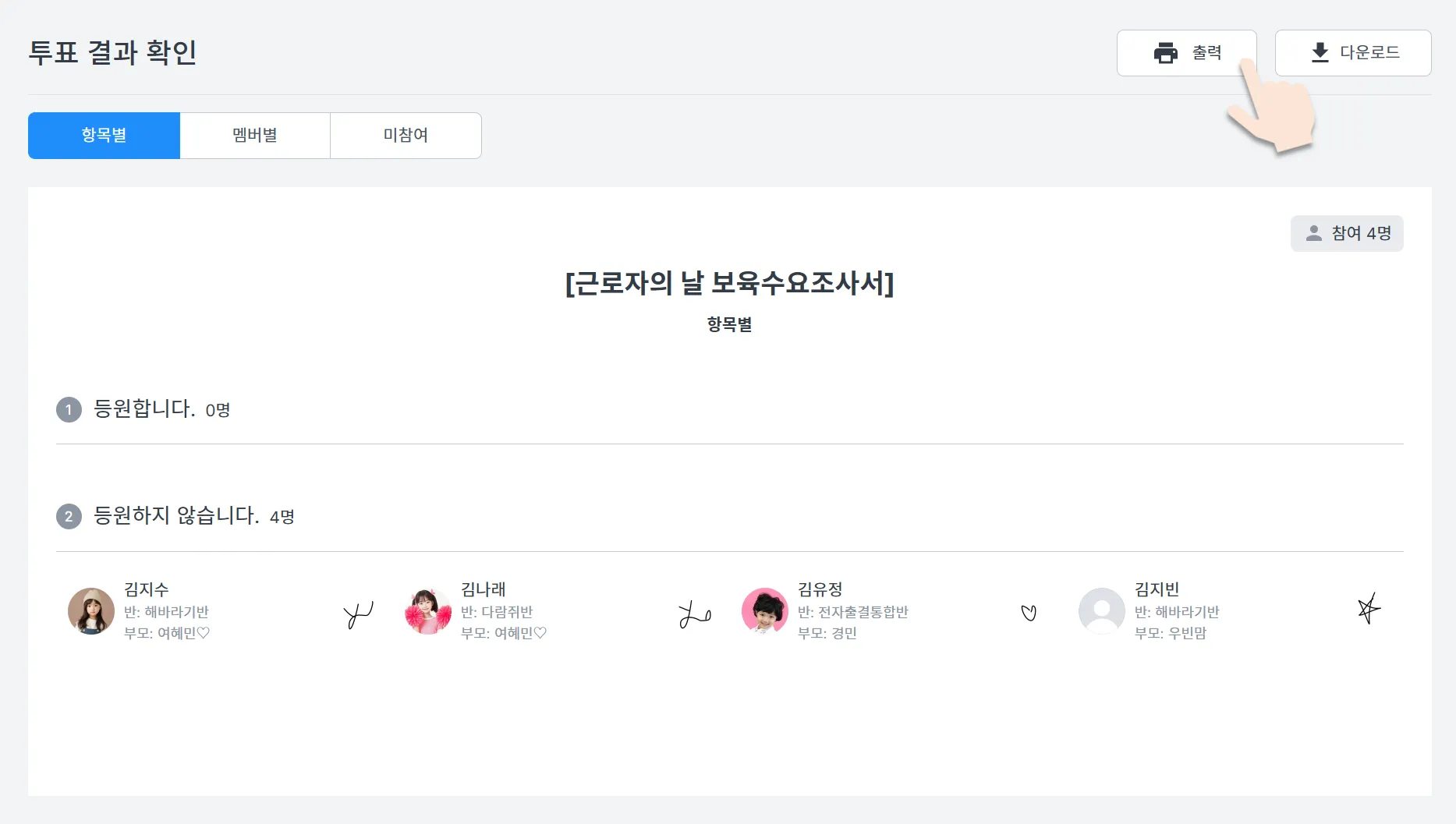 PC 키즈노트 공지사항에서 종료된 투표를 항목별/멤버별/미참여별로 출력하거나 엑셀로 다운로드 할 수 있어요.