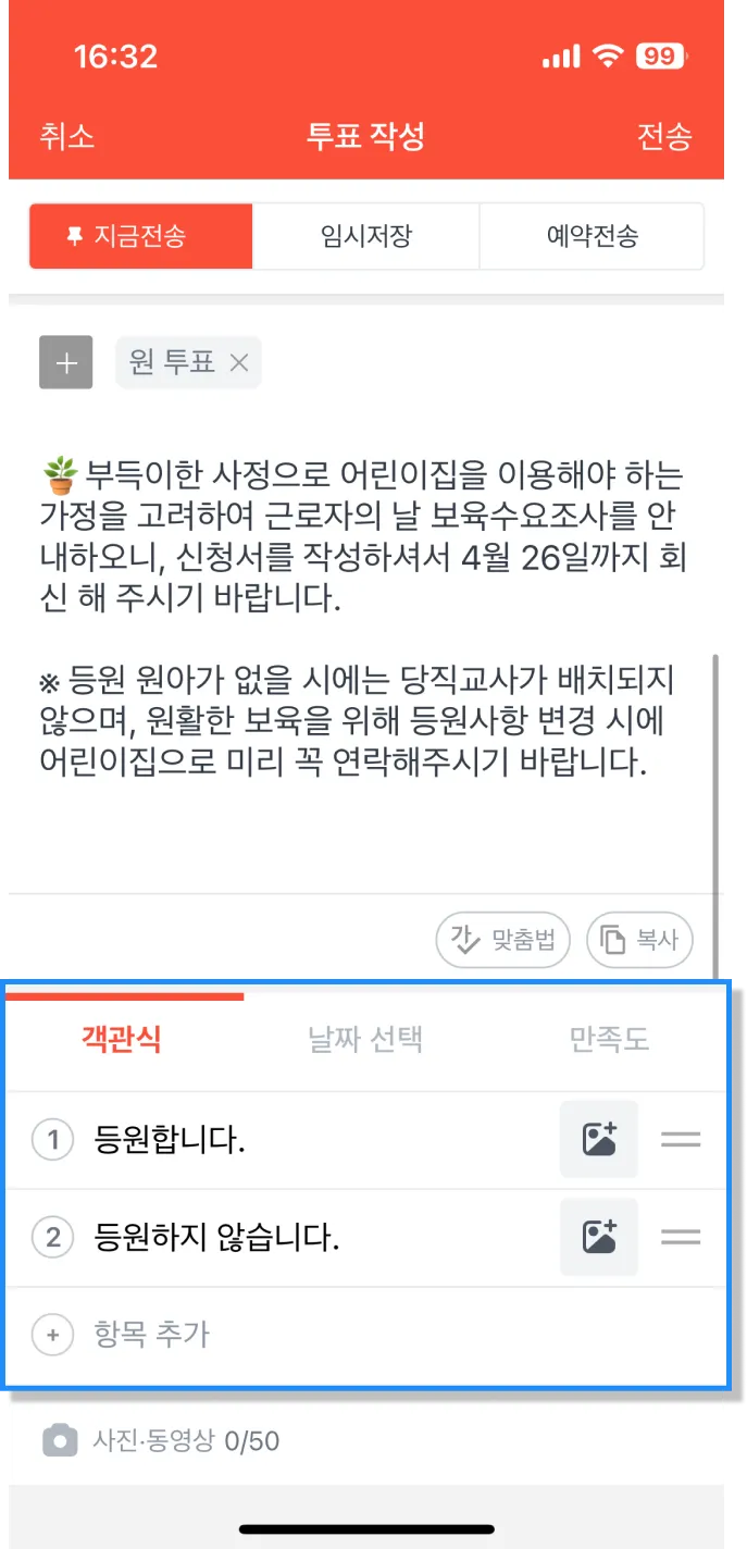 투표항목은 객관식으로 선택 후 수요조사서 항목을 입력합니다.