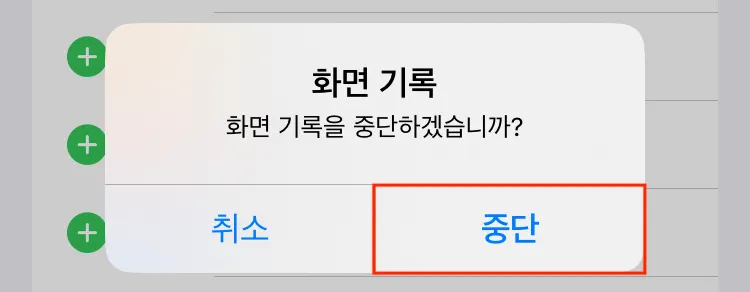 녹화 중지를 원할 때는 상단의 빨간색 부분을 눌러 주세요. 녹화된 파일은 사진 앱에 저장됩니다.